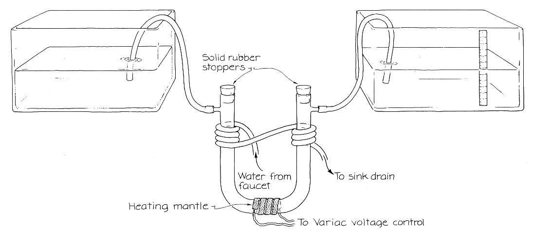 The dimensions of the system are critical to the onset of oscillation. The top surface area of each container must be larger than the cross-sectional area of the tube by an amount that is related to the temperature distribution in the water. The ratio of the area of a container to the area of the tube must exceed 5,000 divided by the maximum temperature difference (in degrees Celsius) that is set up in the water by the heating and cooling. For example, if the system gives rise to a temperature difference of 50 degrees C., the top surface area of the container should be at least 100 times larger than the cross-sectional area of the tube. A smaller temperature difference demands an even larger ratio of the areas. If the containers are unusually large, of course, the oscillation of the water levels may be difficult to perceive. The requirement for the relative sizes of the areas arises from the interplay of pressure on the central volume at the bottom of the U-tube. Suppose the initial disturbance from the environment moves a small amount of water to the right. The resulting asymmetry in temperature tends to drive more water to the right. This flow is countered by the difference in water levels on the two sides. If the top surface area of the containers is too small, the flow immediately creates a difference in water levels that is more than enough to stop the flow resulting from the asymmetry in temperature. Equilibrium is quickly reestablished. If oscillation is to begin, the top surface area of the containers must be relatively large. That way the flow driven by the temperature asymmetry does not immediately yield a large difference in water levels. The flow has time to develop. The period of oscillation is set by the relative areas of the containers and the tube, the length of the tube, the viscosity of the water and the acceleration of gravity. An apparatus similar to Welander's can be made by fusing glass containers on top of a U-tube. Since the tube should be Pyrex to preclude its shattering from being heated and cooled, fusing containers onto the tube seemed too difficult to me. I was also worried about how to mount such a delicate system so that it would stay upright. I chose a U-tube with side arms near the top. Short lengths of rubber hose connected the arms to plastic containers I took from my kitchen. The containers were identical; the top surface area of each one was about 200 times the cross-sectional area of the U-tube. I taped a transparent ruler to the inside of one container so that I could monitor the water level. The U-tube and about half of each container were filled with water. Around the bottom of the U-tube I wrapped a heating mantle of the type that can be found among the supplies of a standard chemical laboratory. This mantle contains a high-resistance electrical wire that supplies heat. I plugged it into a Variac voltage control so that I could regulate the amount of heat applied to the tube. (I took great pains to make sure there would be no sudden leak that would let water reach the electrical line.)