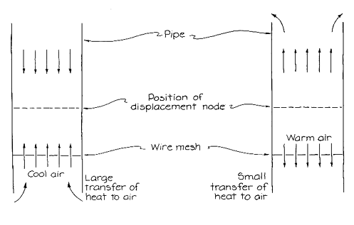 procedure cannot be reversed; you must still heat the brass piece. You might also enjoy monitoring the oscillations in either system by flashing a stroboscopic light on the rocker. Although the motion is slight, it can be amplified by attaching a needle or a thin rod to the rocker at right angles to its long axis. The end of the needle moves through a greater distance than the rocker and so makes observation of the motion easier. Another thermal oscillator was once a standard demonstration in physics classes. A section of wire mesh is pushed about a quarter of the way up inside a vertical pipe. The mesh is bent at the edges so that it remains in place inside the pipe. A burner is set under the pipe so that both the pipe and the mesh get hot. When the burner is removed, the pipe howls for several seconds. The tone is nearly pure because it is the fundamental frequency for acoustic oscillations inside the pipe. This system was discovered in 1859 by Pieter Leonhard Rijke of the University of Leiden. He thought the sound resulted from thermal contraction of the wire mesh and pipe as they cooled. He believed oscillations accompanying the contractions excite the acoustic wave emitted by the pipe. Rijke was wrong; neither the mesh nor the pipe oscillates. The correct explanation was supplied by Lord Rayleigh in 1878. The sound from the pipe arises from the forced oscillation of the air inside the pipe. When the burner is in place, it heats the air in the pipe and forces a convection current upward through the mesh and pipe. No sound is emitted at this stage because the air is flowing steadily upward. When the heat source is removed, the convection current continues for a while because both the pipe and the mesh are hot. The many disturbances of the air in the pipe tend to create an acoustic standing wave in that air. I shall first explain such a standing wave in an unheated pipe and then show how the convection current in the Rijke pipe strengthens it until the pipe howls. An acoustic standing wave inside a straight pipe can be created by the interference of two sound waves traveling in opposite directions through the pipe. The sound waves must be identical except for their direction of travel. They pass through the pipe, reflect from the open ends and then pass through the pipe again. As they pass through each other their interference forces the molecules of air to oscillate by a small amount parallel to the length of the pipe. Because of the repeated interference of the waves a pattern develops in the oscillation of the molecules. The molecules at some places along the length of the pipe never move. Such a place is known as a displacement node. Molecules at other places oscillate by some maximum amount. Such a place is known as a displacement antinode. This pattern of repeated interference of two traveling waves is called a standing wave because the positions of the nodes and antinodes in the pipe are stationary. The simplest standing wave in the pipe is termed the fundamental or the first harmonic. Its pattern consists of a displacement node halfway through the pipe and an antinode at each end. Hence the molecules near the open ends vibrate parallel to the length of the pipe by a maximum amount, whereas the molecules near the halfway point vibrate little or not at all. To excite the fundamental in a pipe the traveling waves of sound must have a frequency equal to the speed of sound divided by twice the length of the pipe. Once a standing wave has been initiated it can grow in strength if more energy is given to the sound waves. The pipe is then said to resonate at the frequency of the fundamental standing wave. The sound emerging from the pipe can be quite loud when resonance is achieved. An acoustic standing wave inside a pipe also sets up periodic variations in the air pressure along the length of the pipe. Consider the node at the midpoint of the pipe when the fundamental is generated. On each side of the node molecules oscillate parallel to the length of the pipe. During one part of the oscillation the molecules on the opposite sides of the node move toward the node, increasing the air pressure there. Half a cycle later in the oscillations the molecules move away from the node, leaving low pressure there. As the molecules oscillate, the pressure at the node varies above and below the atmospheric pressure outside the pipe. The greatest variation in the pressure inside the pipe is at the displacement node. In some physics textbooks the nodes and antinodes of an acoustic standing wave refer to the pressure variations. Thus a pressure antinode (a large variation in pressure) is found at a displacement node and a pressure node (no variation in pressure) is found at a displacement antinode. In Rayleigh's explanation of the Rijke tube the key is the relative positions of the wire mesh and the displacement node (the pressure antinode) at the midpoint of the pipe. The pipe must be vertical so that the heat forces a convection through it. The mesh must be in the lower half of the pipe, not too close either to the lower end or to the displacement node at the midpoint. Assume the various disturbances of the air inside the pipe as it cools somehow initiate weak traveling waves that generate the pipe's fundamental standing wave. Air oscillates through the wire mesh. During part of the oscillation cycle the air must move upward through the mesh and toward the displacement node, building up the pressure at the node. During the other part of the cycle the air must move downward through the mesh and away from the node, leaving low pressure at the node. Rayleigh argued that the oscillation of the air inside the pipe is aided by a transfer of heat from the hot mesh and pipe to the air. The transfer is efficient and beneficial, however, during only part of the oscillation cycle. When the air moves upward through the mesh toward the node, relatively cool air flows into the pipe through the bottom end. Because