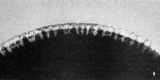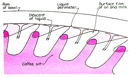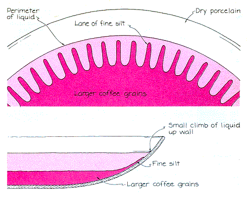 column last month. The drink consists of water, sugar and finely ground coffee grains, all brewed together and served in a cup along with the grains. I prepared so much of the stuff that I began to pour it into bowls instead of drinking it. When I was cleaning up one morning, I discovered a pattern in a bowl of coffee left from the previous night. Along the edge of the liquid, just below the surface, lay a neat array of dark lanes of coffee silt. They and the intervening clear lanes were each a few millimeters wide. I was stumped by the pattern. Not one of the hundreds of unfinished cups of coffee I had left lying around had ever shown it. Is Middle Eastern coffee somehow special? I prepared another batch and left it in the same kind of porcelain bowl. I saw nothing interesting in the period of rapid evaporation from the hot surface, but in rechecking over the next several hours I began to notice the same pattern developing. Although I sat patiently with a flashlight and a magnifying glass, I could not actually see the lanes growing. Since I had tears of strong wine on my mind, I wondered if the patterns could be related. No, the liquid showed little movement up the side of the bowl.