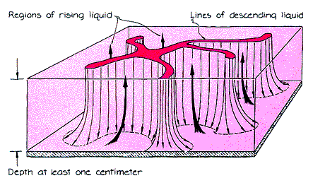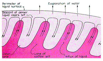 I made a mixture of Middle Eastern coffee and gin with a small amount of red food coloring as a tracer. The alcohol was poured in slowly after the coffee had cooled for a while. Soon tears formed on the upper reaches of the wall but the coffee pattern failed to appear. From this test, however, I received my next clue to the cause of the pattern. Whenever a tear slid down the wall and into the drink, it cleared a lane through the sediment just below the spot where it entered the liquid. In this way the drops soon produced a pattern resembling the patterns I had seen only with the coffee The spacing in the pattern was about 10 times too large, and the pattern varied a lot because the points where the tears entered the liquid shifted. Perhaps a circulation system at the shallow edge of normal Middle Eastern coffee generates the pattern in the silt. Two mechanisms can drive such a system in a naturally evaporating liquid. (Natural evaporation takes place without an additional source of heat, such as a stove, to supply the energy for vaporization.) The liquid might move because of the variation in surface tension over its surface. It might also move because the liquid in an upper level becomes denser than the liquid under it. A circulation system is created when the conditions altering surface tension and density recur as fresh liquid is brought in. For example, circulation cells can be seen in a cup of hot coffee. Hot liquid from the bottom rises to the top, where it cools by evaporation as it flows a short distance over the surface. Then it sinks in narrow, crooked lines to the bottom. The cycle continues until the coffee gets too cool to sustain it. The cells in hot coffee are randomly shaped and constantly changing. In some circumstances and with certain liquids they have ordered shapes and can be quite beautiful. Natural evaporation in liquids drives circulation cells because the evaporative cooling increases the density and surface tension of the liquid. Either the increased surface tension pulls in fresh liquid or the denser liquid sinks and is replaced by fresh liquid. It is usually difficult to determine which of these mechanisms is primarily responsible for a circulation system. According to research published a number of years ago by J. C. Berg and Michel Boudart of the University of California at Berkeley and Andreas Acrivos of Stanford University, neither mechanism operates unless the liquid is deep enough. For water the required depth is one centimeter. Shallower water displays no circulation systems; deeper water has the large circulation cells that can be seen in hot coffee. Several other liquids investigated by Berg, Boudart and Acrivos had circulation systems even when they were quite