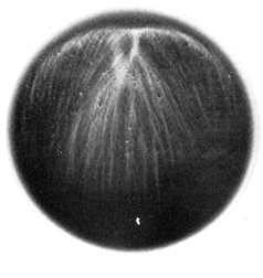 Contamination over the surface of the coffee surely interferes with the natural evaporation of the water from the bowl but may not reduce the evaporation at the edge as much. When some of the water evaporates from an area of liquid at the edge, the remaining liquid is made denser because the concentration of sugar and oil is then higher. This section sinks. As it descends it sweeps out a lane in the silt. Other liquid flows in to replace it. Since the circulation depends on evaporation, it is normally quite slow. Part of the flow can be toward the edge along a lane of silt. If the surface is not too well stabilized by contamination, part of the flow can be along the surface. As evaporation continues more of the clear lanes are swept clean of silt. Some of the intervening lanes of silt may be extended toward the edge by the gentle circulation system, but the diffuse flow does not carry the silt far. The pattern is enhanced by the sugar, which makes the section of liquid left by the evaporation of water near the edge denser. The pattern appears only on moderate slopes. If the slope is too steep, the circulation has no chance to sweep out lanes of silt If the slope is too gentle, the liquid layer near the edge is too shallow for circulation. I suppose the layer of contamination is then too close to the layer of silt to allow any stabilized flow. The descent of the dense liquid from the edge may also be too gradual for the formation of a pattern. I did one final experiment, mixing a teaspoon of milk into my usual Middle Eastern coffee. The oil in the drink and in the milk made a film over the surface. As a pattern developed in the silt along the edge, this film formed into a similar pattern. Above the silt lanes was the film, extending to the liquid edge. Above the clear lanes the surface had no film. This arrangement seems to fit exactly the circulation system I had visualized at the edge of the evaporating coffee. Another observation may support this analysis. I had made instant coffee with milk (the drink is often called white coffee) and had not finished it. The next morning a pattern of white lines streaked the liquid surface. Another pattern of distinct radial lines appeared in the liquid left in the spoon with which I had stirred the coffee. The depth of the liquid did not seem to matter. It was about a centimeter in the cup but only a few millimeters in the spoon. To investigate these patterns I made another preparation of white coffee and poured the mixture into several watch glasses and one metal spoon. I dusted one watch glass with lycopodium powder. Off and on for about 10 hours I checked the samples, particularly near the edge, where I employed a strong flashlight and a magnifying glass. Large patterns of white lines appeared after several hours of evaporation, but I could detect no consistent motion of the lycopodium powder. In one watch glass the pattern resembled the veins in a leaf. In another it consisted of parallel lines across the entire surface. One pattern had what looked like an upswelling because the white lines extended outward from a single point. If I gently disturbed one of these patterns with the tip of a spoon, it usually reestablished itself within an hour or so. Near the edge of the liquid in a watch glass fine-scale patterns appeared. The hair-thin lines of dried milk were roughly perpendicular to the edge. In the spoon the shallow coffee developed the same kind of fine-scale patterns along the edge of the liquid until evaporation had reduced the depth to less than a millimeter. Sometimes the radial lines in the spoon became pronounced and more widely spaced. The coffee itself was apparently not necessary, but it did facilitate my observations. Thin layers of milk evaporating from a watch glass displayed the same kind of fine-scale patterns along the liquid edge. I believe the two types of patterns reveal the circulation systems in the evaporating liquid. The larger patterns in coffee cups resemble the worm-like cells. As the liquid flows across the surface and then descends, milk particles collect over the lines of descent. Hardening there, they mark the paths of descent of the coffee. In addition they may help to stabilize the location of the circulation cells, otherwise the cells would be no more stable than those in hot coffee. The cells also appear to be coupled to the gentle circulation of air over the liquid surface. When a bowl of coffee is exposed to the cool air moving downward from a cold window, the same milk patterns develop. The fine-scale patterns along the edge resemble the patterns in coffee silt and may be due to the same circulation system. Once these milk lines are established, they might stabilize the circulation along the edge. As the water continues to evaporate from the liquid, the white lines harden on the container. When white coffee has fully evaporated from a watch glass, I can hold the glass in sunlight and see a beautiful radial pattern of lines. Bibliography THE MARANGONI EFFECTS. L. E. Scriven and C. V. Sternling in Nature, Vol. 187, No. 4733, pages 186-188; July 16, 1960. INTERFACIAL PHENOMENA. J. T. Davies and E. K. Rideal. Academic Press, 1963. NATURAL CONVECTION IN POOLS OF EVAPORATING LIQUIDS. J. C. Berg, M. Boudart and Andreas Acrivos in Journal of Fluid Mechanics, Vol. 14, pages 721-735; 1966. Suppliers and Organizations The Society for Amateur Scientists (SAS) is a nonprofit research and educational organization dedicated to helping people enrich their lives by following their passion to take part in scientific adventures of all kinds. The Society for Amateur Scientists |