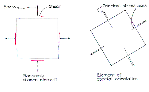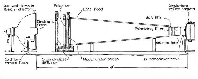 Recently Frank R. Seufert of Cleveland showed me some examples of his photoelastic analysis of models of various objects. When someone is concerned about the stresses on an object, Seufert makes a model of it in Lexan or Tuffak plastic about an eighth of an inch thick. If the object is large, the model is a scaled-down version. Seufert mounts the model in a wood frame and undertakes to mimic the stress on the real object by stressing the model with rubber bands or machine screws. The screws work better because they can be tightened slowly and controlled more easily. Seufert puts the model in front of a polarizing filter and illuminates it with light that passes from a 200-watt lamp through a ground-glass diffuser and then through the filter. Between the model and a 35-millimeter camera (a single-lens reflex model) he positions a long lens hood made out of cardboard. Attached to the camera is a Vivitar 2X teleconverter with its lenses removed. It serves as an extension tube to move the lens farther from the film; a different type of tube would serve as well. Seufert's setup includes a 135-mm. telephoto lens rated {t f2. 5. A second polarizing filter and a light blue filter (designated 80A) are mounted on the lens. The camera is held steady with the DD top piece from a tripod; the piece is attached to a block of plywood. To make a photograph Seufert orients the first polarizing filter with its axis of polarization 45 degrees from the vertical. Then he puts his plastic model in front of it and turns on the lamp. As he sights through the camera he rotates the polarizing filter in front of the lens until a meaningful pattern is superposed on the image. of the plastic model. He records the scene with a cable release that also triggers an electronic flash positioned near the lamp. The extra light is needed for a good photograph. The film is Fuji color negative rated at ASA 100; Seufert has glossy prints made from the negatives. The colored lines in the accompanying photographs reveal the stress patterns in the plastic models. Regions under stress stand out. They are the places where the object is most likely to fail. The first polarizing filter in Seufert's setup polarizes the light. The passage of this kind of light through stressed plastic encodes information about the stresses. The second polarizing filter (the one mounted on the camera) makes the coded information visible to an observer. Figure 3 depicts the stresses on a tiny, thin element that is part of a model being investigated by photoelasticity. Each edge of the element is under stress because of forces pulling perpendicular to the edge. Each edge is also under shear as material on opposite sides of the element attempt to slide in opposite directions.