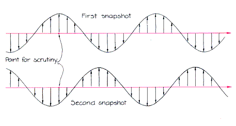 Such is the nature of the stresses on a randomly chosen element. The picture is simplified if a differently oriented element is chosen at this region in the material. The new element is special in that it is square and has two important axes called the principal stress axes. The advantage of considering such a specially oriented element is that its edges are not affected by shear. The only stress on an edge is the perpendicular one. The orientation of the principal stress axes is what is revealed in a photograph of a stressed model illuminated with polarized light. To understand the interaction of polarized light with the principal stresses in the plastic it is necessary to understand the nature of polarized light. According to classical physics, light is a wave composed of oscillating electric and magnetic fields. It is a peculiar kind of wave in that nothing material participates in the wave motion. Water waves accord more with intuition because a wave involves oscillations of the water surface. Something material participates. In the wave concept of light, however, the oscillation is of immaterial electric and magnetic fields. The electric components specify the polarization of light. An electric field is a vector (of a specified size and direction) assigned to a point to be examined, as is shown in Figure 4. The concept is useful when one considers how a charged particle might behave when it is placed at that point. It is also useful in forming a mental picture of light. The illustration can be regarded as a snapshot of a light wave. Superposed on the ray, which indicates the direction of travel, are some of the electric vectors assigned to points along the ray. One point is singled out for scrutiny. At that point in the first snapshot the electric vector is long and points upward. A positive particle there would "feel" a strong force upward.
