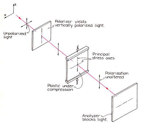 In 1816 David Brewster discovered how the index of refraction can aid in the analysis of stress in a transparent material. When he applied a stress to a sheet of glass illuminated with linearly polarized light, he found a change in the index of refraction of the glass. Moreover, the index then depended on how the light was polarized. To follow Brewster's experiments visualize a vertical sheet of glass uniformly compressed by forces applied at the top and bottom in such a way that the principal stress axes are vertical and horizontal. When the light illuminating the glass is polarized vertically, it encounters a smaller index of refraction and moves with higher velocity than it does when it is polarized horizontally If the glass is under tension (stretched by forces at the top and bottom), the results are just the opposite. A material of this type, with a speed of transmission that depends on the polarization of the light, is said to be birefringent, or doubly refracting. A simple example will demonstrate how birefringence can aid in stress analysis. A vertical sheet of plastic is uniformly compressed to make the principal stress axes vertical and horizontal. The way polarized light interacts with the stressed plastic depends on whether the polarization of the light is aligned initially with one of those axes. You can create such an alignment by illuminating the plastic through a polarizing filter with its axis vertical. On the opposite side place another polarizing filter with its axis horizontal. The first filter is often called the polarizer, the second one the analyzer; the two are said to be crossed. The light passes through the sheet of plastic at whatever speed the stress allows. The light emerging from the plastic is still vertically polarized and is therefore stopped by the analyzer. An observer looking through the analyzer sees darkness. In the experimental setup transmission is eliminated whenever the plastic is illuminated with light polarized parallel to a principal stress axis.