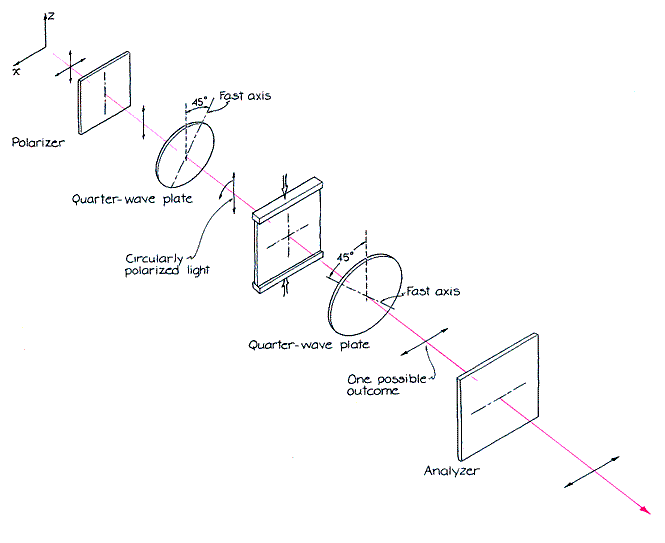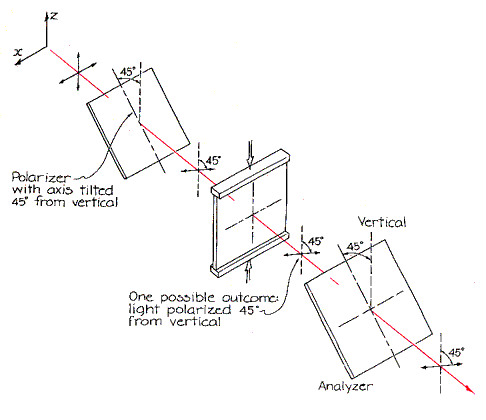 Next rotate each filter by 45 degrees in the same direction. The plastic sheet now receives light polarized at 45 degrees from the vertical. The course of light through the sheet is a bit harder to follow because the polarization must be considered in two components parallel to the principal stress axes. The two components travel through the plastic at different speeds because the indexes of refraction along the two axes differ. When the components emerge from the plastic, they in effect recombine. The light is then likely to have a new direction of polarization. Whether or not the light will pass through the analyzer depends on how the polarization has been changed. To determine the change one must consider how the wavelength of the light is altered by the plastic. For simplicity assume that the light is of a single wavelength. When light passes from air into a transparent material, its wavelength shortens. The larger the index of refraction, the shorter the wavelength of the light in the material. Since stressed plastic has a different index for each principal stress axis, the extent to which the wavelength shortens depends on the polarization of the light. If the light is vertically polarized, its wavelength is divided by the index of refraction associated with the vertical principal stress axis. If the light is horizontally polarized, the wavelength is divided by the index associated with the horizontal axis. When the polarization lies between the two axes, it must be considered in components The vertical component is shortened in wavelength by one amount and the horizontal component by a different amount. As the two components proceed through the plastic with their different wavelengths they oscillate a different number of times. For example, the component polarized parallel to the vertical stress axis might have 1,000 oscillations (wavelengths); the other component, being of shorter wavelength, might have an additional oscillation, for a total of 1,001. The two components begin their trip exactly in step and emerge again in step even though one of them has an additional oscillation. When one mathematically recombines the two emerging components, the electric vectors of the light are found to be oscillating exactly as they were before they entered the plastic. The polarization is tilted from the vertical by 45 degrees. Since the polarizing filters are crossed, the light reaching the analyzer is blocked.