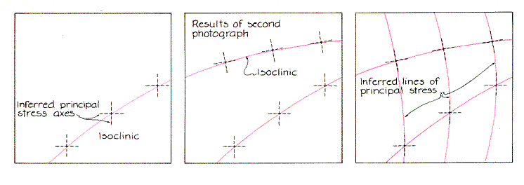 If instead one component has an additional half oscillation, recombination yields a polarization rotated by 90 degrees. This new polarization is parallel to the polarization axis of the analyzer and so the light passes through. Any intermediate result is also possible. Recombination is then harder to visualize. The components do not yield linearly polarized light. Instead the polarization rotates continuously about the ray of light. The electric vector rotates from upward to downward and then back to upward. Light with a rotating polarization is said to be elliptically polarized. (In the special case where the maximum size of the electric vector remains the same throughout the rotation, the light is said to be circularly polarized.) Elliptically polarized light is partly transmitted by the analyzer. The component of polarization that is parallel to the polarization axis of the analyzer is passed whereas the other component is blocked. The point of this discussion is that what the observer sees through the analyzer depends on the angle between the polarization of the light and a principal stress axis in the plastic. Alignment of the polarization with an axis yields darkness at the analyzer. If in misalignment the plastic releases light of unchanged polarization, the analyzer again blocks it. In other instances at least some light gets through the analyzer. The example is simple in that the stress is uniform and the principal stress axes are vertical and horizontal at any point in the plastic sheet. If the plastic is subjected to various stresses, the axes will be oriented differently for each point in it. The purpose of photoelasticity is to discover how they are oriented; in this way one might be able to locate a section in the model that might fail under the stress. When a complex and unknown arrangement of stresses is applied to the plastic, the model as seen through the analyzer has a superposed pattern of the dark and bright lines called fringes. A dark fringe marks points within the plastic from which the emerging light is polarized in exactly the way that keeps it from going through the analyzer. The reason is either that the light passing through one of these dark points is polarized parallel to one of the principal axes or that it has two components (one parallel to each principal stress axis there) that recombine to yield the same polarization the light had when it entered the plastic. In either case the analyzer blocks the light. Usually the first condition creates most of the dark fringes. A fringe caused in this way is called an isoclinic. The pattern of isoclinics reveals the orientation of the principal stress axes within the plastic.