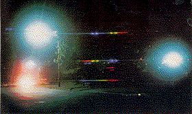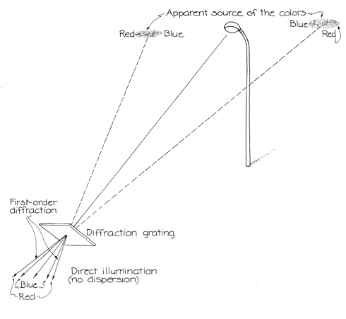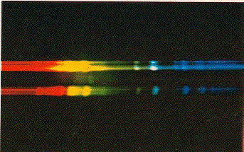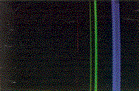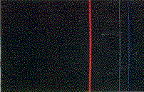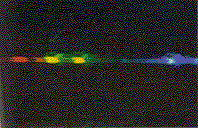 I studied several atomic spectra by taping an inexpensive diffraction grating (13,400 lines per inch) in front of a lens mounted on a 35-mm. single-lens reflex camera. My color film had an ASA rating of 400, but you might try the newer ASA 1000 color film. When I stood near a source, the spectral lines in the first order diffraction tended to overlap because the source was fairly large in my field of view. I backed away to narrow the lines. The lines were then dimmer. I set the camera at its widest aperture and made photographs at many exposure times between 1/4 second and 25 seconds, hoping to hit on the proper exposure. (An instant-copy camera would have greatly decreased my guesswork.) I first photographed laboratory lamps of hydrogen, sodium and mercury. Next I photographed a mercury-vapor streetlight. The lamp emitted light across the full visible spectrum, but against that background I was able to see several bright lines. I saw deep blue (violet), faint green, bright green, bright yellow, faint yellow (or dull red) and bright red. (The photographs reproduced in Figures 1 through 5 do not show the detail in the originals or visible when one looks directly at the light source through the grating.) Most of these emissions are from deexciting mercury atoms. The red emission is from a phosphor in the lamp that enhances its power at the red end of the spectrum.