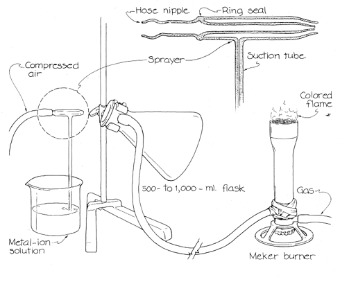 Katz suggests making the inner tube first. Flare one end outward uniformly and draw the other end down to a small diameter. Join the capillary tube to the side of the larger of the nested tubes. Insert the inner tube and join its outwardly flared end to one end of the larger tube. The joint must be airtight. Draw the opposite end of the larger tube down to a small diameter. Make its tip slightly larger and more extended than the tip on the inner tube. With another glass tube form a hose connection that is to be joined to the sprayer. This tube should have a hose nipple to ensure that the rubber hose from the air supply fits snugly. Anneal the glass. Open the bottom end of the capillary tube and grind it flat. The flask should be between 500 and 1,000 milliliters in volume. Attach to its side arm a rubber hose about 15 centimeters long and one centimeter in diameter. Fasten the rubber hose with tape to one of the air vents in the burner. Seal the other vents with tape so that the only supply of air comes from the hose. Natural gas is supplied to the burner in the normal way. The apparatus thus supplies to the flame in the burner air mixed with a metal ion.