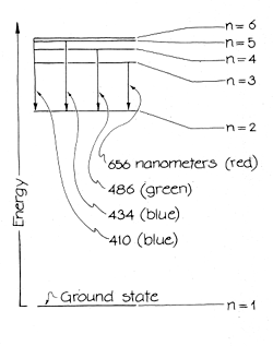 The electron can jump from a lower energy value to a greater one only by absorbing energy from outside the atom. That energy can be supplied by a collision with another particle or atom. It can also be supplied by the absorption of light. After being excited the electron soon deexcites by releasing energy. Either the atom has to run into something to rid itself of its energy or it has to emit light. When a hydrogen atom loses energy by emitting light, the emission forms the spectrum seen in the light produced by a hydrogen lamp. The top illustration at the right gives the allowed energies for the hydrogen atom according to the Bohr model. The lowest level, which is termed the ground state, has a quantum number of 1. The other levels are labeled with larger values of n. The Balmer formula (in its original form) covered the second level and higher ones. For example, if a hydrogen atom is excited to the third level by a collision, it soon deexcites to either of the two lower levels. Suppose it deexcites to the second level. Then it must rid itself of just the right amount of energy to make the jump. Prior to Bohr's work Albert Einstein expressed the fundamental relation between the energy and the frequency of light: the energy is equal to the product of the frequency and Planck's constant. For example, when the hydrogen deexcites from the third level to the second, it must emit light of a certain frequency in order to lose the right amount of energy.
