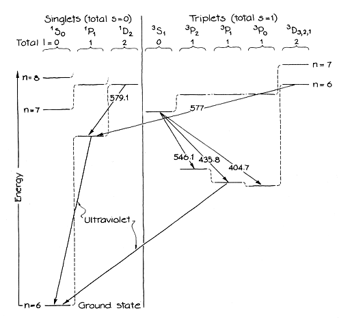 Suppose a sodium atom in a lamp is excited to the P3/2 state. It quickly drops back to the ground state, emitting light to get rid of the appropriate amount of energy. The wavelength of that light is 589 nanometers, which is in the yellow part of the spectrum. If instead the atom is excited to the P1/2 state, it deexcites to the ground state by emitting a slightly smaller amount of energy, because P1/2 is a bit lower in energy. This time the wavelength of the light is 589.6 nanometers, which is the second line of the sodium doublet in the yellow. Thus the presence of the yellow doublet in the sodium spectrum demands the invention of the quantum number j. Otherwise the slightly different yellow wavelengths make no sense. Several other excited states attained by atoms in the lamp are shown in the chart. Soon after excitation the atoms drop back in various ways to reach the ground state. As long as the lamp is lighted the atoms are reexcited. The result is a steady emission of light at the wavelengths arising from all the possible deexcitation I have noted only a few of the possibilities in the energy chart and the drawing of the sodium spectrum. For example, a red emission line results when the valence electron is first excited to the level with n of 5 and l of 0. For a reason I shall not go into the electron cannot merely drop back directly to the ground state. In the chart the deexcitation route must be both downward and to another column of levels. Hence the electron can deexcite by dropping to either the P3/2 level or the P1/2. In one case the electron emits a wavelength of 616.1 nanometers, in the other case one of 615.4 nanometers. The difference in these two wavelengths of red light is due entirely to the difference in energies of the two P states. Thus the two possible values of j for the P states end up creating another closely spaced doublet of spectral lines. An analysis of the spectrum of mercury is similar to that of the spectrum of sodium. An electrically neutral mercury atom has five complete shells and two valence electrons. Although figuring out the quantum numbers for two electrons is more- work than it is for one electron, the procedures are about the same. The energy levels for mercury are shown in the bottom illustration in Figure 12. As before, the state for an unexcited atom is shown at the bottom left. Some of the possible excited states are shown higher in the chart. Mercury atoms in a lamp are constantly being excited to those upper levels and then finding their way back to ground state by emitting light. The major difference in analyzing the energy levels for mercury is that it is necessary to focus on the total l and the total s for the valence electrons. The totals are combined to find the total j, which determines the energy. To aid in such calculations the energy chart is divided into two sections labeled singlets and triplets. Under the singlet label are the energy levels for cases where the two electrons have their spins in opposite directions and so have a total s of 0. The total j for any of these levels is simply the value of the total l. For example, the lowest level under the label P in this section is for the case where one electron has an l of o and the other has an l of 1. The total l is 1. Since the total s is 0, the total j is also 1. In the triplet section the left side under the label S is also easy. Here the total l is o and the electrons have their spins in the same direction to give a total s of 1. Hence the total j can only be 1. The fun begins in the other part of the triplet section. I shall concentrate on the lowest levels under the label P in that section. There the total l is 1 but the total j can have three possible values, each associated with a different energy. The sum of total l and total s gives a value for total j of 2. A subtraction gives a total j of 0. An intermediate value for total j is 1. The energies associated with those three values are shown in the energy chart. Three of the wavelengths in the mercury spectrum depend on these three energy levels. Consider a mercury atom excited by a collision to the lowest S1 level. It can deexcite by dropping to a P level in the same section of the chart. (As with the sodium chart the deexcitation route must be downward and into another column.) Since there are three choices of P levels, the atom can emit light at either 546.1, 435.8 or 404.7 nanometers. With a great many atoms being excited in the lamp some are always dropping out of the Sl along the three routes, giving continuous emissions at the three wavelengths. Thus the presence of this triplet of wavelengths in the mercury spectrum can be understood only with the quantum number j. This is only a start on exploring the spectra of ordinary lamps. You might enjoy working out other features of the sodium and mercury spectrum. Then you might try to analyze the spectrum of a fluorescent lamp, which has a thin coating of phosphor on its inner surface. There are also lamps in which the light is emitted by molecules rather than atoms. It is only fair to state, however, that unraveling molecular spectra can keep you occupied for quite a long time.