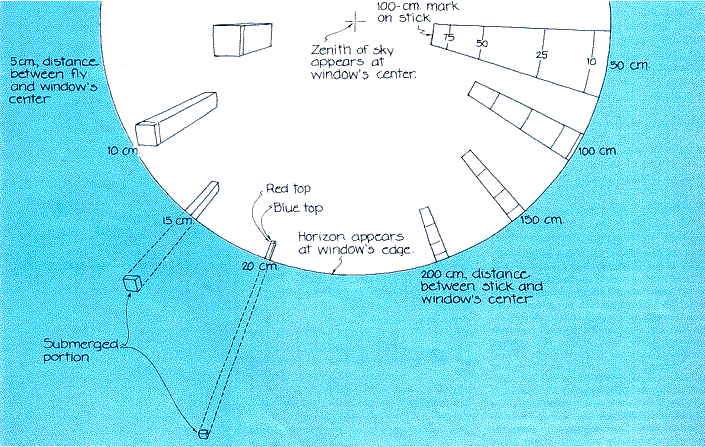 When the fly is moved to 20 centimeters from the center of the window, the apparent contraction of the part above the surface is greater. The bottom of that part still lies at the edge of the window and the top now appears at about .8 centimeter from the edge. This contraction of the image of the part above the surface gives the fish a highly distorted view of the fly. Moreover, the image of the part above the surface may be lost in the clutter at the edge of the window. Recognizing the fly is now more difficult. In addition the image of the part below the surface is well removed from the image in the window. Even if both images are still perceptible, a fish is likely to see two objects, both of them small. Harmon and Cline say that if you are fishing with a fly and can see the fish, cast the fly as close to it as you can. If you can put the fly within the fish's window, it may be recognizable as a fly. At least the images of the part of the fly above the water and of the part below the water are merged. If the fly lies inside the window near the edge, the image of the part above the water is magnified in the sense that its length along a radial line of the window is larger than the true height of the fly.