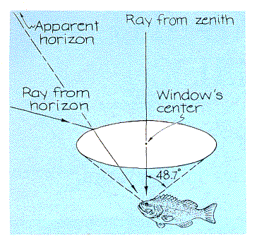 Harmon and Cline point out that dispersion plays a minor role in the image a fish sees in its window. To investigate dispersion I considered the rays of white light extending from the top of my imaginary rectangular fly. One ray refracts at the water surface to send a red ray to the fish. Another ray refracts slightly closer to the center of the window to send a blue ray. The fish sees a colored image where the rays cross through the window. Although the blue image is slightly closer to the center Of the window, the dispersion of the colored image is weak unless the fly is well outside the window. Even then the spread amounts to no more than about a millimeter in the window. What the fish sees on the surface of the water outside the window is largely a reflection of rays that have scattered off the bottom. Although any refraction of light through the surface and into the air must obey Snell's rule, for some rays refraction is impossible. Whether or not a ray refracts depends on the angle of incidence. If the angle is less than 48.7 degrees, part of the light refracts through the surface and the rest reflects downward. According to Snell's rule, the angle of refraction (now in the air) must be larger than the angle of incidence. The angle of refraction can be as much as 90 degrees, however, which it is when the refracted ray barely skims over the surface of the water. If the incident angle is larger than 48.7 degrees, refraction is impossible. The light can only reflect, a situation that is called total internal reflection since the light is unable to escape from the water. Any light that reflects to the fish from the underside of the window must have an angle of incidence smaller than 48.7 degrees. There part of the light also refracts into the air. A ray that reflects just at the window's edge has an angle of incidence of 48.7 degrees, sending a refracted component along the surface of the water. Any light that reflects to the fish from the rest of the surface must have an angle of incidence larger than 48.7 degrees. All this light is internally reflected. The reflections from the window region are likely to be lost in the glare of light from the sky, but the reflections elsewhere might be- bright enough to give the fish a mirror-like picture of the bottom. The optics I have been discussing applies to a situation in which a fish looks out through the sides of an aquarium. Here, of course, the window is in a vertical plane. The anamorphic distortion resulting from refraction would change the geometry of objects outside the aquarium. For example, an object that is in fact square would have the shape of a pincushion. The human eye open in water does not see any of these optical distortions because it is adapted for vision in air. About two-thirds of the refraction necessary for focusing normally takes place at the surface of the eye. Since the eye has almost the same index of refraction as water, a submerged eye loses that refraction. It cannot focus on objects imaged in the window. You can regain focus if you wear a face mask to trap air next to your eye. Is there a window then? There is none if the plane of the mask is parallel to the surface of the water. When the rays pass from the water into the air in the mask, the refraction reinstates their original directions of travel. The cone limiting the rays is eliminated and therefore so is the window. You might want to investigate other orientations of the face mask.