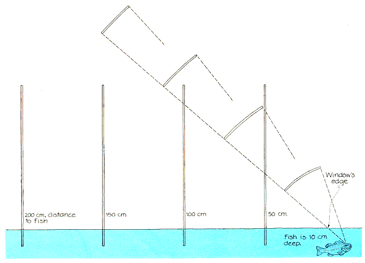 The ray refracted the most comes from near the horizon; it is incident on the water at an angle of slightly less than 90 degrees. The angle of refraction is approximately 48.7 degrees. (The exact angle depends on the index of refraction of the water.) No ray from above the water can reach the fish at a larger angle of refraction. Hence all the rays reaching the fish from above the water fall within an imaginary cone with its apex centered on 1he fish's eye and with its sides 4X 7 degrees off the vertical. Harmon and Cline call the intersection of this cone with the surface of the water the "window" through which the fish sees objects above the water. A ray from the horizon passes through the edge of the window and then down the side of the cone. The size of the window varies with the fish's depth in the water. When the fish is at a depth of 10 centimeters, the radius of the window is 11.3 centimeters. A greater depth gives a wider window but cannot alter the angular size of the cone. That size is set by the refraction of the rays from the horizon. The view of the external world that arrives at the fish is anamorphic: the magnification differs in each of two perpendicular directions. Refraction warps and repositions objects in the fish's view. Perhaps a fish can interpret the anamorphic view, realizing that the objects appearing in the window lie at some distance above the surface of the water. Perhaps instead the fish regards the objects as being on the surface. In either case what does the fisherman look like to the fish? I investigated the question by computer, calculating what the refraction would be from each of four vertical sticks at several distances from a fish. I programmed my home computer to make the calculation on the basis that each stick extends one meter above the water and 20 centimeters below it which is about right to simulate a fisherman standing in shallow water. The fish is assumed to be 1O centimeters below the surface, which is a reasonable depth for a feeding fish. I first considered a stick two meters from the fish horizontally. A ray from the submerged part of the stick is not refracted and is perceived (if the fish can see that far) in its proper place. A ray from just above the waterline on the stick passes through the edge of the window and travels along the side of the imaginary cone that marks the limit of the rays reaching the fish from above the water. The fish might interpret this ray as originating somewhere back along a line making the same angle with the vertical. If it does, the waterline of the stick would seem to lie along a line 48.7 degrees from the vertical.