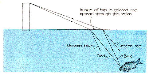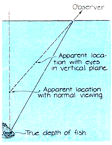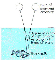 I have briefly considered another refraction problem common to fishing. Can you see a fish in its true location? The problem is crucial if you fish, as a few people do, with a bow and arrow. Should you aim the arrow directly at the fish as you see it? The answer is no. Unless the fish is just below the surface, you should aim lower in your field of view. The rays reaching you from the fish refract according to Snell's rule, ending up with larger angles with respect to the vertical than they had initially. When you receive one of the rays, you mentally extrapolate back along it to find the source, being misled into thinking that the fish is in that direction. Lawrence E. Kinsler analyzed similar problems about the refraction of rays from a submerged object. He pointed out that the depth of an object is misjudged even when your view is from directly above it. Much of your decision about the distance to the object derives from the angle through which each eye must turn so that the eyes together can converge their lines of sight on the object. Since the rays of light are refracted before they reach the eyes, the point of convergence lies above the object, leaving you with the illusion that the object is not as deep as it actually is. Observations from other angles also involve such an error in the assignment of depth. Kinsler's results (for a fish) are summarized in the illustration on the left. One ray is included to represent the light that travels from the fish to the observer. Actually each eye receives a ray from a slightly different direction. The observer believes the fish lies along a rearward extrapolation of the rays. In the illustration the extrapolation is indicated for the single representative ray. The convergence of the lines of sight from the eyes determines where along the extrapolation the fish appears to be. The result is that the fish seems to be higher on a vertical line running through its true location. Such is the illusion for a normal view of a fish. Suppose the observer lies on a dock with his eyes directed downward in a vertical plane. As before the fish seems to be on a rearward extrapolation of the rays reaching the eyes. This time they seem to come from a place higher and closer to the observer. You can check these illusions with a simple demonstration. Fill a tub with water. Look at a coin on the bottom. When your line of sight is well off the vertical, the apparent depth of the coin is obviously inconsistent with the depth of the tub. When you then move your head so that your eyes are in a vertical plane, the apparent position of the coin immediately shifts so that the coin seems to be higher and closer to you.