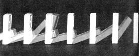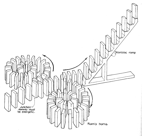 I began looking into how dominoes in a row fall using a row of 50 regular dominoes. At a separation of one domino width the chain reaction took two seconds. With about half that separation the reaction took half as long. I could hear the difference in the timing of the collisions in the two trials. The timing also changed noticeably after the chain reaction had passed the first five or six dominoes, presumably because in the early stages only a few dominoes were moving, whereas later more were falling at any one time. By freezing the action with a snapshot or a strobe light I could see the pattern of the chain reaction. When the leading domino of the moving subgroup is falling toward the next domino, which is still stationary, the leading domino has the preceding domino leaning against it. Several other dominoes in the moving group are also leaning and falling. In a theoretical analysis of the chain reaction D. E. Shaw of Villanova University found that at any one time about five dominoes are in motion. I next examined how the chain reaction ascends and descends a smooth ramp. The incline must of course be a shallow one or it will not be possible to stand the dominoes on end. When the chain reaction traveled up a properly inclined ramp, the dominoes had to be spaced farther apart than dominoes in a level chain. A chain reaction going down the ramp was much faster and succeeded with any spacing less than the height of a single domino. The chain reaction could-also be made to climb a small flight of shallow stairs, but the reaction was quite slow.