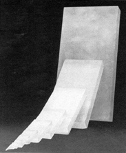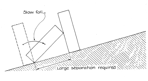 I glued some of the smaller dominoes together to make new dominoes two or three times deeper than the originals. Repeating my experiments, I found that the doubly deep dominoes required a least distance of separation of 2.2 centimeters. (My computer estimate was 1.5 centimeters; energy losses in the real collisions again accounted for the difference.) The triply deep dominoes almost toppled one against the next, but friction held them at the last instant, leaving them at a tilt. My calculations showed that the necessary least distance in spacing increases as the depth of the dominoes increases. The reason is that each domino must fall farther in order to gain enough kinetic energy to topple the next one. When the required least distance is almost equal to the height of a domino, the energy transfer is inefficient and the chain reaction stops. A line of cube blocks cannot topple in a chain reaction because the required least distance exceeds the height of the blocks. Next I returned to some of my earlier demonstrations. Normally a chain reaction of dominoes is initiated with a vigorous rap on the first domino. Each domino in the chain passes through its position of precarious stability with more than enough energy. Hence even when the dominoes are spaced closely and have little chance to fall, the collisions move them safely through their position of precarious stability. The kinetic energy in the wave is large enough for the wave to split at a junction and then travel along two chains. A chain reaction can be set off on a ramp provided the ramp is not too steep. The weight vector must point toward the lower face of the-domino. You will also find that the dominoes must be separated more than they need to be on a level surface.