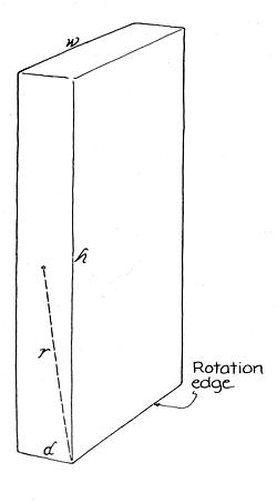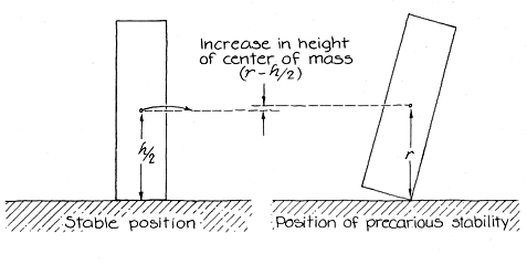 If the domino has a mass m, it has a weight mg (g representing the acceleration of gravity). The potential energy of the domino at any instant during rotation is the product of the domino's weight and the height of the center of mass above the table. Hence to lift the center of mass from a height h/2 to a height r I must provide the domino with an energy of mg(r - h/2). If my blow delivers less energy, the domino cannot pass through the position of precarious stability and will fall back to its original orientation. If I deliver more energy, the domino falls over. The key to the instability of an upright domino lies in its shallow depth. Consider a domino of fixed height and width. If the domino is narrower and the weight are low. Only a little energy is needed to lift the center of mass through the position of precarious stability. A light tap of the finger is enough. If the domino is wider, all the other factors (r, the weight and the energy needed to lift the center of mass) are larger. A tap of the finger does not provide enough energy and does not topple a thick domino.
