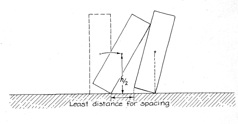 With my home computer I estimated the values of the least distance for dominoes of various shapes. I assumed that the collision completely transferred the kinetic energy of one domino to the next. I also assumed that afterward the lean of the first domino helped to push the second one through the position of precarious stability. To find the least distance I had the first domino pass through its position of precarious stability with no kinetic energy. To impart enough energy to the second domino the center of mass of the first has to fall to a height of h/2. My estimate of the least distance for my small dominoes was .7 centimeter and for the larger ones 1.9 centimeters These estimates were below my experimental results of 1.2 and 2.3 mainly because my calculations assumed a perfect transfer of kinetic energy in the collisions. In a real chain reaction some of the energy is lost to vibration of the dominoes and to friction as they touch each other. When I lubricated the faces of the dominoes, the experimental results decreased only slightly, implying that vibration contributes more than friction to the loss of energy.