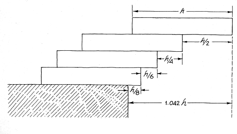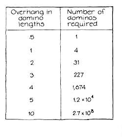 Since each domino is 1.5 times large in every dimension than the preceding one, the last is not only 64 times larger than the first but also 262,144 times heavier. With a center of mass 64 times higher than that of the first domino its potential energy is almost 17 million times greater. A slight nudge on the first domino gives it about .024 microjoule of kinetic energy. The kinetic energy of, the last domino as it completes its fall is !$ about 51 joules, which is two billion w times the amount imparted to the first domino. Whitehead made his dominoes out of acrylic sheets, sandblasting them to make them smoother. He laminated several thin sheets to make the larger dominoes. When he lines up the group of 13 dominoes for a chain reaction, each domino is separated from the nextlarger one by about its own width. Could a chain of dominoes be designed with a scale factor larger than 1.5? Assuming an ideal transfer of energy in the collisions, I think a scale factor of about 2.5 is the limit for dominoes shaped like Whitehead's. Larger scaling iD factors are possible if the ratio of height to depth is increased. You might like to experiment with this problem. Here is a puzzle. The object is to stack dominoes at the edge of a table so that the stack leans out from the edge as far as it can without falling to the floor. Each domino is positioned with a broad face down and its long dimension at right angles to the edge of the table. How should the dominoes be laid so that the top one is displaced from the table's edge by the maximum amount? What is the smallest number of dominoes needed to make the top domino completely clear the edge of the table? Is there a limit to how far the stack can extend from the table? A problem of this kind was posed in 1955 by Paul B. Johnson. His solution was later simplified by Leonard Eisner, who also applied it in a prank. One night Eisner and another graduate student constructed a leaning stack of a library's volumes of The Physical Review, leaving the disconcerting overhang as a surprise for the librarian. (They were presumably too young to have learned that if you need help from librarians, or even if you want to avoid being fired from the university, you had better not fool around with the library volumes.) Consider the first domino put down. It is stable as long as its center of mass is over the table so that the weight vector cannot supply a torque. Its maximum stable overhang is achieved when its center of mass lies almost over the edge. Now you put a second domino under the first. The outer edge of the lower domino acts in place of the edge of the table to keep the top domino from rotating. How should this pair be placed on the table? The combined center of mass of the pair, which lies midway between the centers of the dominoes, must be placed over the table's edge to achieve the maximum stable overhang. No computation is needed. A few trials will reveal the proper balance. When a third domino is put under the first two, the combined center of mass of the three dominoes must be above the edge of the table. This procedure can continue.indefinitely. With a stack of n dominoes the distance between the edge of the table and the outer edge of the top domino is given by the series (h/2) (1 + 1/2 + 1/3 + 1/4...1/n), where h is the long dimension of a domino and the expression in the second set of parentheses is the harmonic series. I programmed my computer to sum the expression to any wanted number of dominoes. At least four dominoes are required if the overhang is to exceed h, making the top domino fully clear the table. To have the top domino clear the table by two domino lengths you must stack 31 dominoes. Thereafter the number goes up rapidly. You will need 12,367 dominoes to make the top domino clear the table by five domino lengths and 1.5 X 1044 to make it clear by 50 domino lengths.