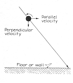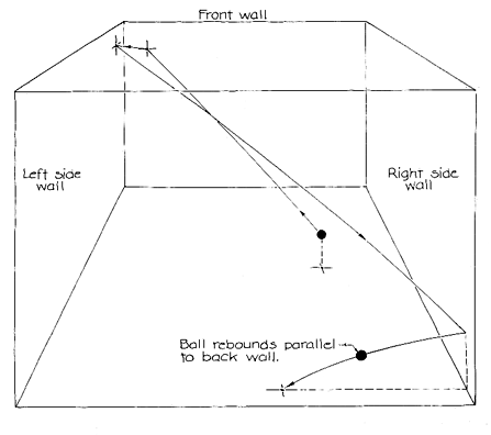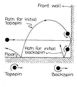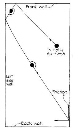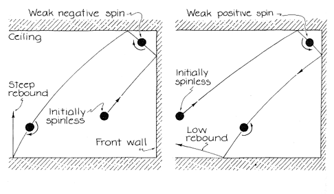Usually my stroke gives the ball little or no spin, but it ends up spinning as soon as it bounces from a wall or from the ceiling. Consider a ceiling shot, which I often make to change. the pace of the game. My opponent must adjust not only to the new path but also to strange hops off the floor. Suppose I make the ball bounce from the front wall to the ceiling. It leaves the ceiling with a clockwise spin. When it hits the floor, its parallel velocity is sharply reduced, making it bounce almost straight up. My opponent, who is expecting a rebound path resembling the path of the approach to the floor, waits too far back in the court. If I make the ball bounce from the ceiling to the front wall, it approaches the floor with a counterclockwise spin. The collision with the floor increases the parallel velocity, sending the ball into a low hop. Again my opponent misjudges the rebound path and misses the ball. Both ceiling shots are better if I start them from about midcourt. Then the spin as the ball approaches the floor is strong and the strange-hop is enhanced. Suppose the ball is bounced off the front wall so that it moves toward the left side of the court. If you take an overhead view and ignore the curvature of the path due to gravity, the arrangement is similar to the one in which a solid ball is thrown at an angle to the floor. The collision reverses the perpendicular velocity (in this case the velocity perpendicular to the front wall), decreases the parallel velocity (the velocity toward the left side wall) and imparts a clockwise spin. In the overhead view the final path is steeper with respect to the front wall than the initial path because of the reduction in the parallel velocity. An opponent can quickly learn how to deal with this type of rebound in racquetball. A more difficult shot to anticipate is one that bounces from two walls. Consider an overhead view of a shot in which the ball bounces from the front wall and then from the left sidewall. The first bounce gives the ball a clockwise spin and a velocity directed toward: the rear wall. Can you make the ball rebound from the side wall in any direction you choose or is the final angle of rebound fixed? Can the final spin be zero or any value of clockwise or counterclockwise rotation? To answer these questions I employed some mathematics published independently by Richard L. Garwin of Columbia University and George L. Strobel of the University of Georgia. Assume the ball is launched toward the front wall with no spin and has a small initial perpendicular velocity. You can make such a shot if you are near the front of the right side wall. Then an ideally elastic racquetball rebounds from the left side wall at an angle of about 12 degrees. If you are closer: to the center of the court, the initial perpendicular velocity is larger and the angle of the rebound from the left side wall is smaller; the ball travels along the wall to the rear of the court.