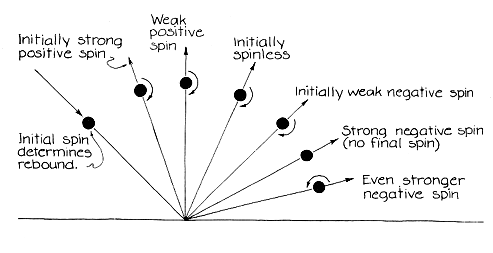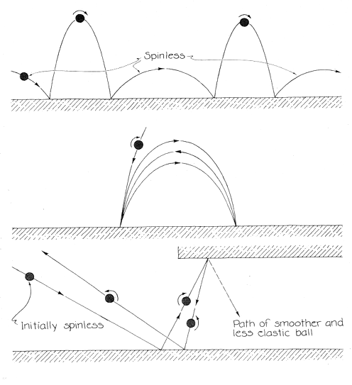 I also considered events in which the ball makes several bounces on the floor. Suppose the ball is thrown-to the right without spin. The first bounce reverses the perpendicular velocity (so that the ball goes upward), decreases the parallel velocity and imparts a clockwise spin. The ball rises to its maximum height and falls back to the floor. The-surprising feature is that this second bounce restores the initial spin (which was zero) and parallel velocity. The result is the same regardless of the initial values of spin and parallel velocity. If the ball continues to bounce along the floor, its initial values of spin and parallel velocity are restored after every even number of bounces. The phenomenon was readily apparent in the action of the elastic toy ball. I painted the equator of the ball so that I could monitor the spin. When I threw the ball to the floor with no initial spin the first bounce was high and short, so that the ball did not move very far horizontally before the-next bounce. The spin was clockwise. The second bounce was low and long. The ball had essentially no spin. Thereafter the ball repeated the pattern of a high, short bounce followed-by a low, long one. Since the ball was not totally elastic, each bounce was less energetic than the preceding one. A perfectly elastic ball would periodically resume its initial spin of zero and its initial parallel velocity. The interactions of spin and parallel velocity account for the-strange actions of a ball thrown to the floor so that it strikes the underside of a table.-If the ball is initially without spin, it bounces from the floor on a steep path with a rapid clockwise spin; when it hits the table, it rebounds to the left with a counterclockwise spin. The second bounce from the floor is also to the left with a counterclockwise spin. The perpendicular velocity has been reversed three times but is unchanged in amount. The parallel velocity is now toward the left and is almost unchanged in amount. .Hence the ball almost return6 to the launch site.: Suppose the ball were smoother and less elastic. The first bounce would result in a weak spin and the second (from the underside of the table) would not be to the left; The ball would continue to travel to the right until it exhausted its kinetic energy.