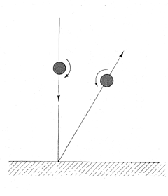 Suppose you put a clockwise spin on the ball. The collision directs the-ball onto a new path. At the collision with the floor the spin creates a friction force toward the right, reversing the direction of spin. Because of the friction force the ball also acquires a parallel velocity so that it-bounces to the right. The energy for the parallel velocity is taken from the energy of the initial spin. Energy is also transferred when the ball is thrown to the floor at an angle and without spin. I had expected the path after such a bounce to be just as steep as the initial path, but it is steeper because the collision red uces the parallel velocity, converting some of its kinetic energy into spin energy: In terms of angular momentum the collision reduces the amount associated with the parallel velocity and increases (from zero) the amount associated with the spin. The total kinetic energy and the total angular momentum are conserved. The steepness of the path after a collision depends on the initial steepness and the spin. When the initial spin is negative (clockwise), the final steepness is less than it is when the ball is thrown down without spin. A strong spin directs the ball along a low path over the floor. When the initial spin is positive (counterclockwise), the ball may bounce forward in a steep path, upward perpendicular to the floor or even backward, depending on the strength of the initial spin. The bounce is straight up if the ball initially has just the right amount of positive spin. (The product of the spin and the radius of the ball must be equal to three-fourths of the ball's initial parallel velocity.) With more counterclockwise spin the ball rebounds to the left. If the spin is less than the threshold amount,: equal to zero or negative (clockwise), the rebound is to the right: The steepness of the rebound can be understood in terms of the friction where the ball touches the floor. The friction force is opposite to the direction in which the surface of the ball is moving. At the moment of contact the surface motion has two sources: parallel velocity and spin. The friction opposes the sum of these two motions. For example, if the ball is thrown down at an angle and without spin, the surface touching the floor is moving to the right: The friction force acting on the surface is toward the left, which reduces the parallel velocity. The ball bounces toward the right with less rightward velocity than it had before the collision. Since the amount of perpendicular velocity is unaltered by the friction, the ball bounces in a path steeper than the one it followed in approaching the floor.
