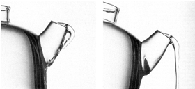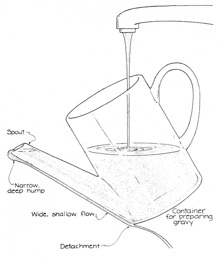 A related example of clinging flow is the Coanda effect, named after Henri Coanda, the Romanian engineer who discovered it. Sometimes the name is applied to the teapot effect, but usually it serves to describe two separate phenomena. When a jet of fluid (either a gas or a liquid) emerges from a slot and passes a shallow step, it can attach itself to the wall at the base of the step. The attachment results from an entrainment of the ambient fluid between the jet and the step. I do not believe this phenomenon is a factor in the teapot effect. Sometimes the term Coanda effect refers to the attachment of a fluid stream to a continuously curved surface. Suppose a horizontal jet of water is directed at the side of a beach ball. As the surface of the ball begins to curve away from the jet it creates a partial vacuum at the adjacent water surface. Since the free surface of the jet remains at atmospheric pressure, the pressure difference across the jet forces the jet against the ball. This phenomenon is quite similar to the teapot effect except for the partial vacuum. I did an experiment similar to the one Reiner had done with salt. In a container of warm water I put an ice cube tilted so that as water melted from the top surface it would run down that surface. (The freshly melted water sinks, because it is denser than the ambient warm water.) On the top surface I deposited a drop of food coloring so that I could monitor the flow. The stream rounded the downward edge of the cube and ran down the side for a few millimeters before it detached and fell to the bottom of the container. I next did several experiments on the flow of water from a clear plastic container used in the preparation of gravy. Normally after cooking meat I pour the drippings and grease from the pan into the container, wait until the grease separates into a layer on top of the drippings and then pour off the drippings For this purpose the container has a pouring spout extending from the bottom so that the bottom fluid rather than the top fluid is poured. In my experiments I clamped the container to a ring stand mounted on the basin of my kitchen sink. Water ran from the faucet into the container and then through the pouring spout. I could adjust the angle of the container. In addition I could vary the rate at which water entered the container and thus the rate at which it left the spout.