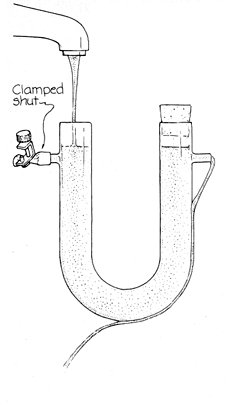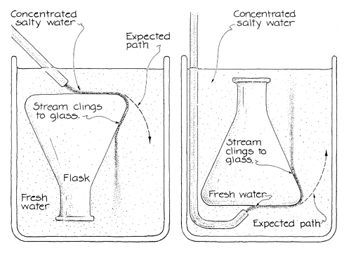 I also experimented with a U tube made with side arms. I stoppered one of the open ends of the device and put the other end in a slow flow from the faucet. Water emerged from the side arm on the stoppered side. With the flow adjusted carefully the stream left the side arm in a rearward arc and then reattached itself at a low point on the U. Usually this arrangement was unstable because the stream would immediately pull up and cling to the full underside of the side arm and the tube. I was curious about how far an inverted stream of water would flow if the surface of an object was tilted at a moderate angle. In my backyard I set up a seven-foot length of flat metal tilted from the vertical by about 45 degrees. At the upper end of its underside I attached a garden hose. As I adjusted the flow of water I produced an inverted stream that traveled the length of the metal. Sometimes the stream rounded the side edge of the metal and then flowed along its upper side. Sometimes the stream (either inverted or on top of the metal) slowly oscillated like a snake. I did similar experiments with slender rods of metal, glass and plastic held at a moderate angle. I adjusted the stream from the faucet until it was narrower than the rod. When the stream struck the rod off center, it traveled along the underside of the rod and then spiraled around it several times. It never traveled upward in relation to the basin, but at some points it did travel horizontally. The spiraling results from the curvature of the rod. Since the stream is forced to follow the curvature because of the pressure difference across its depth, it initially circles the underside of the rod and then the top side. This motion continues down the length of the rod. The spiraling disappears when I replace the narrow rod with a wider one held at the same angle. Then the stream attempts to spiral but ends up looping back to the underside of the rod, whence it descends as an inverted flow. In a final experiment I placed a round measuring cup in the stream from the faucet. The circular cross section was in a vertical plane, so that the stream struck on one side. The stream clung to the side, following the curve until it was below the cup. Then it began to travel upward from the basin for a short distance before it detached. Apparently the pressure difference responsible for the inverted flow of the stream is strong enough to make the stream actually flow uphill before gravity slows it enough to pull it free of the cup.