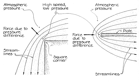 In another experiment an Erlenmeyer flask was submerged and inverted in a large container of fresh water. A stream of concentrated salty water was directed onto the bottom of the flask past a piece of permanganate. The stream flowed along the bottom, turned the edge and then continued down the sloping side instead of arcing away from the flask. After several centimeters it became unsteady, detached from the flask and proceeded downward. In the next experiment the flask was placed right side up in a container of concentrated salty water. A stream of fresh water was directed at the bottom of the flask. The stream rounded and -then flowed along the sloping side of the flask instead of arcing upward off the bottom. After traveling for a few centimeters it oscillated and broke free, rising to the surface of the salty water. Reiner experimented with other solids. He altered the slopes, produced streams of sinking cold water in a container of warm water and replaced the smoothly curving edge of the glass flask with a sharp edge of metal. Whatever he did, the streams still rounded the edge and adhered to the solid for at least a short distance. Reiner also examined the flow of water poured from a teapot. Again one fluid (the water) flowed through another (the air) in the presence of a solid surface. If the flow was fast, the stream left the spout in an arc with no dribbling. If the flow was slow, the stream sometimes went along the spout and then broke off at the bottom of the pot. Sometimes the flow left the lip of the spout in a rearward arc. Flowing at an intermediate speed, the stream split in two; one part moved in an arc and the other ran down the spout. An explanation of the teapot effect was published in 1957 by Joseph B. Keller of New York University. To follow the flow one constructs lines called streamlines that are everywhere tangent to the velocity vector of the water. If the water flows over a horizontal surface, the streamlines are all horizontal, indicating a uniform flow. If the water flows over and past a shallow obstacle, the lines crowd together, indicating an increase in the rate of flow. The illustration below shows streamlines for flows over an edge of a square corner and of a thin plate. In both cases the lines crowd together, indicating an increase in the speed of the water. The lines nearest the solid surface crowd together the most, indicating the greatest increase in speed.