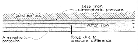 When a portion of a stream of water increases in speed, its kinetic energy increases also. Suppose the flow is not significantly downward, so that one can rule out gravity as the cause of the increase in energy. Then the energy must come from the pressure in the liquid, which can be regarded as a form of potential energy. When the speed of a portion increases, the pressure at that point decreases. The total energy of the portion, that is, the sum of its kinetic energy and the energy associated with the pressure, remains constant. Since the total energy of a streamline is constant, the increase in speed of the portion at an edge necessitates a decrease in the pressure there. The pressure of the water on the free surface of the stream is kept constant because of the continuous push by the air. Hence when the stream reaches the edge, a difference in pressure exists across its depth, with atmospheric pressure on the free surface and a reduced pressure at the edge. It is this pressure difference that can force the stream to flow over the edge. A stream of water carries momentum because it has both speed and mass. When you pour water rapidly, the momentum is too great for the pressure difference at the edge of the container to make the stream flow over the edge. The stream arcs from the container in the normal way. With less momentum (slower flow) the pressure difference is sufficient to make the stream turn. Consider the stream after it has rounded the edge of a plate. Keller discovered that the stream can flow along the underside of the plate. Again the streamlines are all horizontal, indicating that the velocity vectors of the water elements across the depth are parallel and the same size. There is still a pressure difference across the depth. At the bottom of the stream (on the free surface) atmospheric pressure prevails; at the top of the stream (next to the plate) the pressure is lower. To understand this pressure difference consider a stationary pool of water. Atmospheric pressure pushes on the surface.