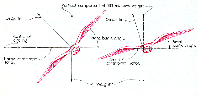 MacCready is known for his construction of human-powered aircraft. His earliest observations of soaring birds inspired the construction of the Gossamer Condor, which in 1977 won the Kremer Competition by being the first man-powered aircraft to fly a figure-eight course. (The aircraft is now on display at the National Air and Space Museum.) The feasibility of the flight arose from MacCready's calculations on bird soaring, specifically his calculation of the output of power that is required. MacCready began his observations and calculations on bird soaring in 1976 by watching turkey vultures (Cathartes aura) as they glided smoothly in circles. With the help of his children he measured the time a bird took to complete a circle and also the bird's angle of bank (the angle between the horizontal and the plane of the bird's wings). Holding a protractor at arm's length, MacCready measured the bank angle as a bird flew toward him and as it flew away. The average of the two measurements and the time of circling were recorded. MacCready also observed the soaring of black vultures (Coragyps atratus) and of the best soarers of all frigate birds (Fregata magrifices). He again monitored frigate birds while he was on vacation in 1980 at La Paz in Mexico. In 1982 he videotaped the flights with a zoom-lens television camera. When the tape was reviewed, he measured the bank angle on the monitor's screen. A clock incorporated into the tape player recorded the time. The results in 1980 and 1982 were surprisingly different. In 1980 the average bank angle was 23 degrees and the average time for a full circle was 9.1 seconds. In 1982 the average angle was 39 degrees and the average time was 9.4 seconds. MacCready noted that the flights were at a much higher altitude in the second set of observations. The higher flights made measurements of the angles less accurate because of perspective. To correct for this problem he reduced the average bank angle to 36 degrees for the 1982 data. Still the puzzle remained. Why did the birds soar at a steeper angle in the higher flights? I shall return to this question after I introduce MacCready's calculations on flight efficiency. A gliding bird descends slowly in relation to the air through which it flies If the air is rising faster than the bird descends, the bird gains altitude in relation to the ground. A circling bird usually maneuvers to stay within the rising air. The lift on the bird's wing is a force from the air that is perpendicular to a line connecting the wing tips. It is also perpendicular to the flight path. If the bird is flying level, the lift is entirely vertical and counters the bird's weight. When the bird banks, the lift is tilted from the vertical by the angle of bank and acquires a horizontal component. Only the vertical component of the lift is available to counter the bird's weight. If the component is too small, the bird sinks in relation to the rising air. If the component is too large, the bird rises. The horizontal component of the lift provides a centripetal force maintaining the circular motion. The size of the component depends on the strength of the lift and the bank angle. MacCready derived a mathematical formulation whereby one can compute the speed of the bird once the bank angle and the time of circling are measured. His formula relies on three relations: (1) A bird soaring in a circle has matched the vertical component of lift to its weight. (2) The horizontal component of the lift generates circular motion and thus is equal to the bird's mass multiplied by the centripetal acceleration, which can be calculated as the square of the speed divided by the radius of the circle. (3) The speed of an object in circular motion is equal to the circumference of the circle divided by the time required to complete a circle.