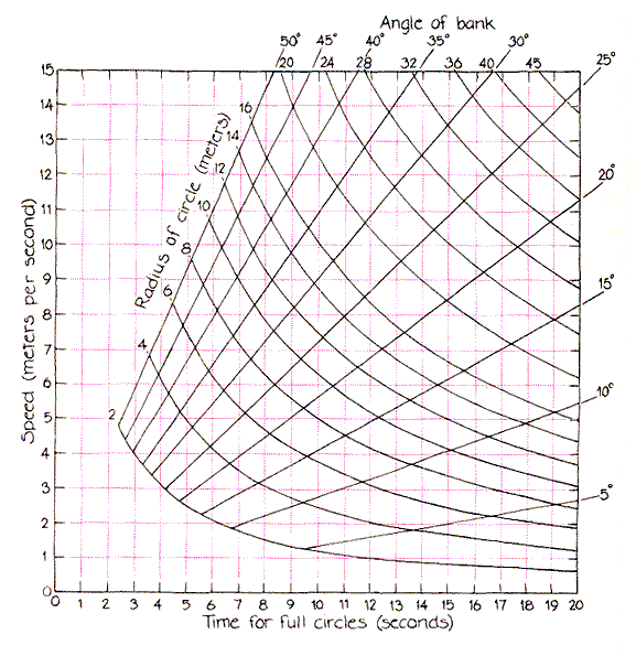 Armed with these three relations, MacCready found that the speed of the bird is proportional to the circling time multiplied by the tangent of the angle of banking. Once the speed is known the radius can be computed from the relation between the speed and the circumference. The full formulation is displayed in Figure 3. The relations are also plotted as a graph in the bottom illustration. The graph can be used in the field. First measure the bank angle of a bird soaring in a circle and the time it takes to complete a circle. Mark the time on the abscissa of the graph. Now move upward on the graph until you reach a straight line marked with the bank angle you measured. (You may have to interpolate between two such lines if the angle is not shown.) From that intersection move directly to the ordinate, from which you read the speed of the bird. For example, if a bird completes a circle in nine seconds at an angle of 20 degrees, its speed is about 5.1 meters per second. You can also read the radius of the circle from the graph. When you have moved directly upward from the point representing the circling time to the intersection with a line of bank angle, determine the radius from the nearest curved line representing radii. In my example the radius is about 7.3 meters. MacCready calculated on the basis of his field observations in 1980 that the birds glided at an average speed of S.9 meters per second in a circle with an average radius of 8.5 meters. The birds he observed in 1982 glided at 10.4 meters per second in a circle with a radius of 15.3 meters. Another parameter is the bird's coefficient of lift, which is defined in terms of the loading of lift on the wings. The loading is the lift divided by the total surface area of the top surfaces of the wings. The coefficient of lift is the ratio of the lift loading to the excess pressure generated at the front of the bird by the forward movement. This excess pressure is equal to half of the density of the air multiplied by the square of the bird's speed. The actual value for the coefficient of lift depends on the bird's angle of attack, the angle at which its wings meet the passing air. The largest useful value for the coefficient is obtained for the angle that results in stall, the instance in which the airflow over the top of the wing breaks away from the wing instead of moving smoothly to the rear edge. MacCready is interested in how large the coefficients can be for the soaring birds. Are they larger than the ill coefficients that aircraft built by human beings can achieve?