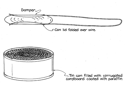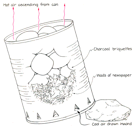 The can functions as a chimney because cool air is sucked in through the open flap at the bottom to replace the hot air rising to the top and out through the holes there. The strong flow of air through the can fans the fire and keeps it burning briskly. You could make the stove without the loose end plate held near the top. That plate, however, helps to produce a nearly uniform temperature over the entire cooking surface. Without this plate the part of that surface directly above the heat source would be hotter than the rest of the surface because it receives more radiation from the source. The loose plate is intended to heat the small layer of air above it, transferring heat to the cooking surface evenly by the conduction and convection through the air. A popular heat source for the stove is a "buddy burner," a small can filled with corrugated cardboard over which hot paraffin has been poured. When the can is brought out for cooking, the paraffin is solid. A match melts and vaporizes some of it, and thereafter the vapor burns. The flame melts more paraffin, which is drawn to the top of the cardboard, where it vaporizes and burns. The cardboard also burns, but slowly, like the wick of a candle. A damper can be placed over part of the burner to slow things down if the stove gets too hot. Make the damper by fold ing the lid from the can over a doubled piece of wire. Charcoal briquettes also serve well as a heat source, but it is hard to light them. One easy solution is to put them in a can that works like a chimney. Cut both ends off a large can and punch flaps into the side near one end. Fold the flaps inward. Push large wads of newspaper against them so that they hold the paper in place. Prop the can against a rock with the paper downward. Leave an air space between that end and the ground. Put the briquettes in the can and ignite the newspaper. The flame pulls air into the bottom of the can to replace the hot air rising through the briquettes and out of the can. The strong flow of air makes the flames ignite the briquettes. When the newspaper has burned up and the briquettes begin to fall to the ground, lift the can off them. You now have your cooking fire.