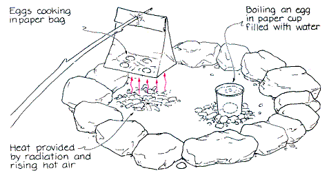 If the upper part of the cup is dry and receives enough heat by radiation from the coals or the rising hot air from them, it will ignite. To boil an egg in a paper cup you would do well to put enough water in the cup so that when the egg is in place, the cup is nearly full. The same principles apply when you boil water in containers made of canvas, bark, leaves or coconuts and placed directly on the coals. This fact about water accounts for another curious technique in cooking. Crack an egg (or more than one) into a small paper bag. Close the bag and fold the top down several times. Pierce the folded section with a stick. Prop the stick so that the bag is suspended above hot coals. The eggs will cook. The water in them keeps the bag from reaching its ignition point. One drawback of this technique is that the eggs tend to adhere to the paper. My son Christopher found that the problem can be surmounted by coating the bottom interior of the bag with margarine or butter. (Some people solve the problem by lining the bottom of the bag with bacon. I avoid this procedure; if I cook the eggs for the proper length of time, the bacon is not cooked enough. Moreover, in order to kill the parasitic worm Trichinella spiralis that might reside in the bacon, all of the meat should be heated to at least 149 degrees F. The bacon in the bag is not that fully heated.) You could look into a variety of other outdoor-cooking schemes. The most intriguing ones require only components that can be found in nature. You might also study the relative reflectance of thermal radiation by the two sides of aluminum foil or the rate at which heat is conducted through material such as an orange skin. Let me know what you find.