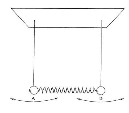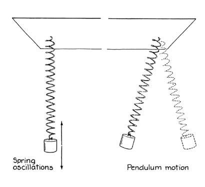The motion of the pendulums is coupled by means of the rod. When one pendulum is made to swing parallel to the rod, it moves the rod, which then moves the other pendulum. These pendulums, like the spring-coupled ones, have two normal modes in which they do not exchange energy. Any motion of the system that is not a normal mode is expressible in terms of the normal modes. In such cases the system displays beats. As before, the normal modes arise from symmetry. In the first normal mode the pendulums swing exactly in step. Since in this mode the rod swings too, the effective length of the pendulum must be measured from the pendulum bob all the way to the rigid support from which the rod is suspended, because the full length takes part in the swinging. The frequency associated with this mode is low because of the long effective length of the pendulums. In the second normal mode the pendulums move in opposite directions and the rod is motionless. The effective length of the pendulum is now measured from the bob only to the rod, because only that much of the string takes part in the swinging. The frequency of this normal mode is high because of the short pendulums. The coupling between the pendulums involves only motion parallel to the rod. If one pendulum swings perpendicular to the rod (that is, perpendicular to the vertical plane passing through the rod), that motion is retained because the string winds and unwinds around the rod without moving it much. If a pendulum swings both parallel and perpendicular to the rod, the perpendicular swing is maintained and the parallel swing generates beats. Priest and Poth demonstrated this motion with small scale models and also with a larger model. In the larger model two playground swings hung from a rod suspended from a ceiling. A student sat in each swing. After one of the students was pushed and began to swing, the system moved like the pendulums in the small models. The related system in which pendulums hang from a string and swing perpendicular to its length has been studied by Michael J. Moloney of the Rose-Hulman Institute of Technology in Terre Haute, Ind. The motion of the pendulums is coupled because each swinging pendulum pulls the interconnecting string, which then influences the motion of the other pendulum. Each pendulum also twists the string Since this action complicates the mathematical analysis, Moloney reduces its importance by placing the pendulums at least 10 centimeters apart. In one normal mode the pendulums swing in step. The effective length of the pendulum is then the vertical distance from the bob to the rigid support because that full length participates in the swinging. In the other normal mode the pendulums swing exactly out of step, which decreases their effective length and results in a higher frequency. The system displays beats when the pendulums swing in some pattern other than a normal mode. The resonant-spring pendulum is related to the systems I have discussed so far, but it lacks normal modes and is harder to analyze mathematically. Nevertheless, you can easily set up such a system and can analyze its behavior in approximate terms. If you pull the mass downward, stretching the spring, and then release it, the spring's vertical oscillations are soon replaced by a pendulum motion. Since once you release the spring the energy of the system remains constant, the energy of the pendulum motion must come from the energy in the oscillations of the spring. When the transfer is complete, it reverses, so that the spring oscillations reappear and the pendulum motion dies out.