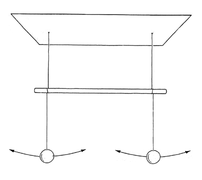 The other sinusoidal variation modifies the amplitude of the swinging. The frequency of the modification is equal to the difference in the frequencies of the normal modes, and so it is lower than the frequency at which the pendulums swing. The result is a gradual variation in the swinging amplitude of each pendulum. At maximum F amplitude the pendulum has all the energy of the system. At zero amplitude the pendulum is at rest. Since the modifications of amplitude are exactly out of step, one pendulum peaks in amplitude as the second comes to rest. For other ways of activating the system the pendulums may swing differently, but they will still display beats in which their amplitudes vary. You may have heard audible beats if you have ever listened to two pure tones that differ slightly in frequency. The sound you hear is not either of the two waves actually reaching your ears but rather a sound with a frequency t that is the average of the frequencies of the two waves. Its amplitude, which is related to the intensity of the sound you hear, varies at a rate that is the difference between the two frequencies. Hence the sound you hear waxes and wanes as the two waves beat against each other. The system in which two pendulums are coupled by a rod has been analyzed by Joseph Priest and James Poth of Miami University in Ohio. The system came to their attention during a production of My Fair Lady, when an actor accidentally bumped a suspended stage panel. The panel hung from one end of a horizontal rod; an identical panel hung from the other end. The rod was suspended by two cables. When the first panel began to swing, parallel to the rod (in the vertical plane passing through the rod), its energy was gradually transferred to the other panel. Thereafter the energy passed periodically from one panel to the other, creating a noticeable distraction from the play. Priest and Poth studied a similar system in which two pendulums are supported by a horizontal rod. The string of each pendulum runs from the rigid support of the system to the rod, once around the rod and then to the pendulum bob.