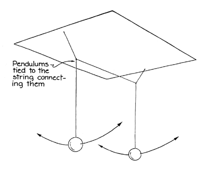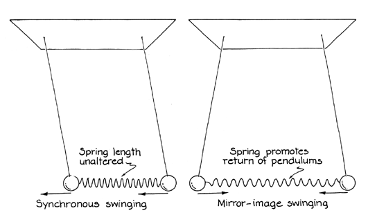 Intuition suggests that the interconnecting spring will force the initially stationary pendulum into motion until both pendulums swing chaotically, each with roughly the same amount of energy. Surprisingly, the pendulums do not end up in this state. Instead the energy is periodically exchanged between them in such a way that sometimes one of them stops and at other times the second one stops. What accounts for these phenomena?