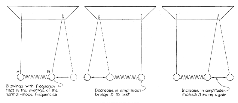 The normal modes arise from symmetry. Suppose pendulums A and B are both pulled the same distance to without changing the length of the spring. Indeed, they swing just as they would without the spring. Since the spring transfers no energy, this synchronous swinging is one of the normal modes. The other normal mode can be created by pulling the pendulums equally far to opposite sides. When they are released simultaneously, their motions are mirror images. In this normal mode the spring is stretched and compressed by the pendulums. Therefore it does influence their motion. The force it exerts on A is symmetric to the force it exerts on B. For example, when it pushes A to the left, it pushes B just as much to the right. Since the symmetry in the forces precludes a transfer of energy between the pendulums, their amplitudes remain constant. When a pendulum is free to swing by itself, its swinging frequency is proportional to the square root of the ratio F of the acceleration of gravity to the length of the pendulum. In the first normal mode each pendulum swings at that frequency. In the second normal mode the pendulums swing at a higher frequency because of the driving force from the spring. For example, after the pendulums swing toward each other, compressing the spring, they return to the vertical not only because of gravity but also because of a push by the spring. When the pendulums swing away from each other, the spring exerts a pull. The push-and-pull action drives the swinging at a high frequency. Normal modes are important because any motion of the system can be described as a combination of them. Suppose you actuate the system by displacing and then releasing only pendulum B. Thereafter the movement of each pendulum is expressible as a multiplication of two sinusoidal variations. One of them is rapid, having a frequency that is the average of the frequencies for the normal modes. Whenever a pendulum is active, it swings at this frequency.