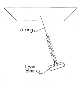 This exchange of energy is optimal if the mass attached to the spring stretches the spring to about 4/3 of its initial length. The purpose of the increase in length is to decrease the pendulum's frequency in order to establish a relation between the frequencies associated with pure spring oscillations and those associated with pure pendulum motion. The spring oscillations must be twice the frequency of the pendulum motion. Then the instability that develops in the system is large enough to drive the mass into pendulum motion. Martin G. Olsson of the University of Wisconsin at Madison was one of the first to study the spring-pendulum system. To increase the spring length by the proper amount one must test various weights hung from the spring. Not all springs are suitable for the demonstration. J. G. Lipham and V. L. Pollak of the University of North Carolina at Charlotte have pointed out that in practice one must consider the mass of the spring itself in addition to the mass hung from it. They found that to create the proper relation of frequencies the spring must be stiff. Lipham and Pollak made a pendulum with a spring they bought from the Central Scientific Company (11222 Melrose Avenue, Franklin Park, III. 60131-1364). It is part of a "Hooke's Law Apparatus" (catalogue number 73 960). The mass of the spring is 3.4 grams, the unstretched length five centimeters. A force of about .41 newton stretches it by one centimeter. To make a weight for the spring Lipham and Pollak melted lead in a 50milliliter Pyrex beaker, allowed it to cool and then got it out by breaking the glass. A cotter pin or a length of wire threaded through a hole punched in the lead served to attach the weight to the spring. Lipham and Pollak tested the weight on the spring and then trimmed it until they found the optimum mass, which turned out to be 73 grams. (If you trim too much lead, add slotted weights from a common laboratory balance to the block to "tune" the apparatus.) Lipham and Pollak also devised a way to use weak springs in the demonstration. (The task is to decrease the frequency of the pendulum motion without altering the frequency of the spring oscillations.) They lengthened the pendulum by adding a string between the spring and the support from which it was suspended. If the spring could be released with no horizontal displacement, it would oscillate only vertically; the pendulum motion would not develop. In practice, however, the release always includes some horizontal displacement of the mass hanging on the spring. The ensuing instability in the oscillations builds up the pendulum motion. When the spring oscillations dominate, as they do initially, the excitation of the pendulum motion is said to be an example of parametric resonance. The term indicates that the pendulum motion depends on a quantity (the length of the pendulum) that is itself oscillating. The result is a transfer of energy to the pendulum motion. (Parametric resonance also accounts for one's ability to pump a playground swing to a greater amplitude. The periodic shift of the swinger's legs and torso alters the effective length of the pendulumthe swingso that energy is fed into the pendulum motion.)