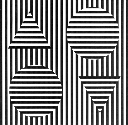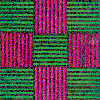The apparent color is surprising for several reasons. It appears only if the second grating has the same orientation and spacing as the first one. Although the apparent color may grow fainter with time, it appears even if the observer delays viewing the second grating for hours, days or weeks. (Its strength after a delay depends partly on the dietary and sleeping habits of the observer.) A person who has normal color vision should be able to see the McCollough coloration by viewing the gratings below. Begin with the colored gratings on the left. Note that the black stripes of the horizontal gratings are interspaced with green and those of the vertical gratings are interspaced with magenta. Be sure the illustration is well illuminated. Do not fix your gaze but shift it so that you see each differently colored region for about the same amount of time. After five minutes or more examine the colorless gratings in Figure 3. The demonstration works better if the illumination is now low. You should perceive faint, unsaturated colors superposed on the white stripes. The colors you perceive are associated with the orientation of the black stripes. Whereas previously the horizontal stripes were interspaced with green, they are now interspaced with magenta. The vertical stripes change color in precisely the opposite way. You can verify the fact that the colors are associated with the orientation of the stripes by rotating the illustration 90 degrees. Again magenta appears with horizontal stripes and green with vertical stripes. The shapes of the regions are not important; the association of the color is with orientation. One should not mistake the McCollough effect for the phenomenon known as a negative afterimage. The color in that phenomenon is fleeting compared with the McCollough coloration. To demonstrate a negative after-image fix your gaze on a field of green color for about five minutes and then on a white, featureless surface. For a short time you will perceive magenta. If you delay viewing the white surface by 10 minutes or more, the afterimage fails to appear.