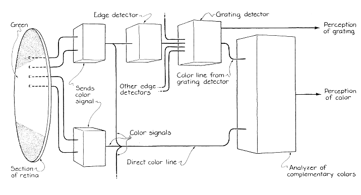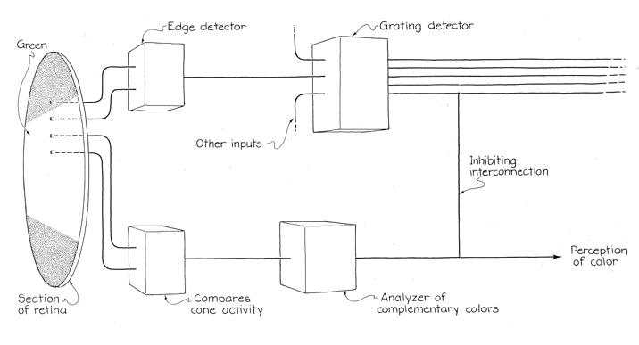 The McCollough effect might be explained in terms of this model. As you view a horizontal grating of black-and-green stripes, strong signals are sent along two lines. One signal concerns the green of the light and the other signal concerns the orientation and spacing of the grating. An inhibiting interconnection begins to build between the two lines, somewhat weakening the signal of green. The inhibition is not large enough for you to notice it in normal room light. Although the strength of the interconnection builds up within five minutes or so, it may last for hours or even longer. Suppose you look later at a colorless grating that has the same orientation and spacing as the first one. On the color line the signal strength is zero because the grating has white stripes. If the color signal continued to be zero, the perception would be of white. The inhibition imposed by the interconnection, however, makes the strength of the signal negative. The color signal then registers magenta, and you perceive magenta on the colorless grating. Inhibition is imposed on the color line only if the grating detector actuates the output line that has the strengthened interconnection. If some other output line is actuated, the color , line is unaltered. Suppose you rotate the grating until it is vertical. The signal from the grating detector moves along another output line, the color line is not inhibited and the McCollough coloration disappears. Although this model fits many of the experiments done with the McCollough effect, it is unsatisfactory. Why should the output line of a grating detector inhibit the color line? I am also troubled by the following experiment. If the model is correct, the inhibiting interconnection should be built up if you shift your gaze over a colorless, horizontal grating alongside a green region. Yet such an arrangement actually fails to produce a McCollough coloration. For the fun of it I devised a different model for the McCollough effect. I do not know if this model has been studied before. It differs from the preceding one in that the grating detector is itself color-sensitive, sending a color signal into the analyzer that compares complementary colors. The analyzer sums the signal from the grating detector and the principal color signal coming directly from the retina. The strength of the color signal from the grating detector depends on the recognition of the grating. The color sensitivity of the grating detector may be an unavoidable consequence of the fact that it and the edge detectors analyze signals from color-sensitive retinal cells. In part the detection of an edge may depend on the contrast of color on its two sides. Hence a signal from the grating detector about color is not surprising. Suppose you view a horizontal grating of black-and-green stripes. After making a match with a standard grating, the grating detector sends a signal out along an output line concerning the orientation and periodicity of the grating. Because of the match, the detector sends to the color analyzer a signal about the green in the grating. Suppose the direct signal is +200 units and the green signal from the grating detector is +1O. The signal that emerges from the color analyzer is +210 units, which is perceived as green. As you continue to examine the grating, the detector grows less responsive to both the grating and its color. After a while the detector begins to reduce its signal about the grating characteristics and you get a poorer perception of the grating. The detector also begins to inhibit the signal of green, sending instead a signal of magenta to the color analyzer. Suppose the strength of the magenta signal is -10 units. If the direct signal of green is again +200, the signal emerging from the color analyzer is +190: a slightly weaker green than before. When you replace the colored grating with a colorless one of the same spacing and orientation, the grating detector recognizes the grating and again sends a signal of magenta to the color analyzer because of its inhibition to green. Note that at this point the color from the grating detector is triggered by the recognition of the grating, not by the strength of any color signal arriving from the edge detectors. If the magenta signal has a strength of -10 and the direct color signal is zero (because of the whiteness of the stripe being viewed), the color analyzer sends out a signal of -10: a faint magenta. Hence when you view the colorless grating, you perceive a faint magenta superposed on the white stripes. This coloration is the McCollough effect. What if you look at the colorless grating in dim light? The coloration is more prominent not because of greater signal strength but because the illumination from the white stripes is weaker. You can then pick out the magenta coloring better. The coloration is still apparent even if the light is so dim that the cones no longer function. In such light the visual cells called rods provide vision. They send no color information, but they do serve to detect edges and thus feed a signal to the grating detector. Since the grating detector is still fatigued because you had looked at a grating earlier, the signal it sends to the color analyzer is still -10 units of magenta. You still perceive the coloration. From the model I figured that under the proper lighting conditions a signal of magenta from a fatigued grating detector might cancel a small, direct signal of green. For example, if the magenta signal is -10 and the direct green signal is +10, they sum in the color analyzer as zero. A green stripe in the grating would then appear to be h gray: it is both colorless and dim. Does this graying actually take place? If it does, would the green reappear if I rotated the grating so that the stripes were vertical and the grating detector therefore was forced to carry out a new task of recognition? Suppose an isolated green mark lay in another part of my field of view. Would I still see it a