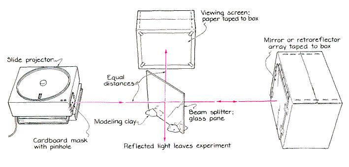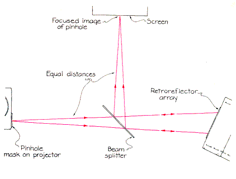 Retroreflecting arrays are available at sporting-goods stores and automobile-accessory shops in the form of flexible plastic sheets sold as safety reflectors. Sewn onto clothing, fastened to a bicycle, glued to a highway stripe or attached to a variety of other objects, the reflectors make the objects more visible at night. For example, when the headlights of an automobile strike an array, the light comes strongly back as a warning to the driver. The success of the application is actually due to an imperfection in the arrays If the retroreflectors returned the beam of light precisely instead of spreading it slightly, the entire beam would return to the headlights rather than to the driver. To do Pepper's experiments you should buy a retroreflecting flexible plastic sheet that is at least three centimeters square. If you can find only narrow strips, cut them up to form the square. Tape it onto a sturdy box. Set up a slide projector so that it shines on the array. If possible, remove the projector's front lens. Mount on the front of the projector a thick piece of cardboard through which you have made a hole two or three millimeters in diameter. The pinhole serves as a point source of light. If you do not have a projector, set up a bright flashlight or even an ordinary incandescent bulb to shine through the pinhole. In order to see the shape of the returned beam, you must split off part of it and direct it to a viewing screen. You can do this by placing a glass pane in the beam at an angle of about 45 degrees. The glass should be clean and clear, but it does not have to be of excellent optical quality. Glass from a picture frame will do. Hold it in place with modeling clay or with the frame from which the cardboard backing has been removed. When the beam from the pinhole reaches the glass, it is split into two beams. One beam continues on to the array and the other is reflected out into the room. The beam reflected from the array comes back to the glass, which makes another split. One beam passes through the glass, returning to the pinhole. The other beam is reflected from the glass to a sheet of paper that serves as a viewing screen. Since light is reflected from both the front and the back surface of the glass, the screen displays two slightly displaced images. You will get less displacement and a clearer image with a thin piece of glass serving as the beam splitter.