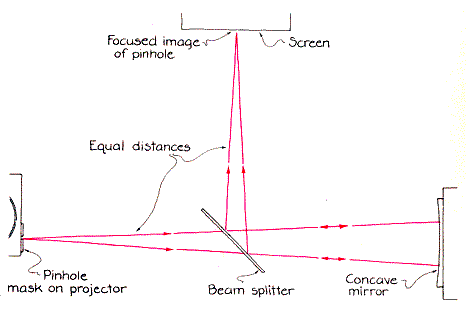 The action of these mirrors and of the retroreflecting array can be understood with the help of Figure4. Part a depicts the reflection by a flat mirror. The pinhole is represented by a point source of light. Waves of light flow from the point source. Each one displays a wavefront that is part of a sphere. One such wavefront is shown in cross section as part of a circle centered on the point source. As the wavefront travels away from the point source, the radius of the circle increases. When the wavefront reaches the mirror, sections of it are reflected to form a new wavefront traveling in the opposite direction. The reflected wavefront is part of a circle centered on an imaginary point source of light to the right of the mirror. The imaginary source is as distant from the mirror as the true source is. The reflected wavefront cannot form an image of the pinhole because it continuously grows larger, never attaining a focus. When the beam splitter directs part of the light to the screen, the entire screen is illuminated by the expanding wavefront. Part b of the illustration demonstrates the action of the concave mirror. The mirror reflects and focuses the incident wavefront, but the light returns to the source only if the pinhole lies on the focal point of the mirror. Since the screen is as far from the beam splitter as the pinhole is, a clear image of the pinhole is formed on the screen. For other positions of a concave mirror the light spreads more broadly over the screen. If the mirror is not oriented symmetrically on the beam, the focusing of the light is skewed. The result is either a distorted image or no image.