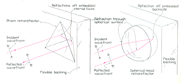 Part c of the illustration represents the action of a highly specialized mirror system that is related to the commercial retroreflecting array. It is called a phase-conjugate mirror [see "Optical Phase Conjugation," by Vladimir V. Shkunov and Boris Ya Zel'dovich, Scientific American, December, 1985, and "Applications of Optical Phase Conjugation," by David M. Pepper, Scientific American, January]. This ideal retroreflector exactly reverses the light rays incident on it. Moreover, the reflected wavefront preserves the shape and orientation of the incident wavefront. With such an ideal mirror all the returned light that passes through the beam splitter travels through the pinhole. The fraction of the light that travels to the screen forms an exact image of the pinhole. The retroreflecting sheets Pepper employs are less than ideal. Each retroreflector in a sheet returns a section of the wavefront, preserving its shape and orientation as is shown in part d of the illustration. Because the retroreflectors lie in a plane, however, the sections do not fit together to re-form the initial wavefront. Instead they are spread along a curved line that is identical with the wavefront reflected by the flat mirror. For this reason the sheets are said to be pseudoconjugators. Each section of the wavefront returns to the pinhole or to the image of the pinhole on the screen, but together they lack the coordination that would be seen with a true phase-conjugate mirror. Nevertheless, a fuzzy image of the pinhole forms on the screen as piece after piece of the wavefront arrives. The retroreflectors in plastic sheets come in two types. One type consists of prisms embedded in the plastic. An arriving light ray is reflected from one of the internal faces of the prism and then from a second and possibly a third internal face. It travels out of the plastic parallel to the incident ray. The retroreflector is not perfect because the returned ray is displaced from the incident ray and because the section of the wavefront is inverted by the prism. (The retroreflector is so small that the section of wavefront can be regarded as straight.) The Reflexite Corporation manufactures this type of retroreflecting array. The prisms are clustered in hexagonal cells, each cell .15 millimeter across. Areas of the array that are between the cells do not take part in retroreflection.