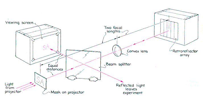 When you do this demonstration, you may be confused by an extra spot of light on the screen. Because of the imperfect construction of the retroreflecting array? part of the light returning from it is reflected in the same way as light is reflected from a flat mirror. If the plane of the array is perpendicular to the beam of light, this mirrorlike reflection reaches the screen and can be confused with the pinhole image formed by retroreflection. The extra spot of light is easy to identify because it shifts over the screen if you tilt the array with respect to the beam. You can remove the spot by erecting a cardboard folder between the array and the screen so that the laser beam just clears the edge of the folder. Then rotate the array until the mirrorlike reflection appears on the folder and is thus blocked from the screen. Many experiments can be done with the laser, the retroreflecting array and common mirrors and lenses. I particularly enjoyed blowing smoke or throwing fine powder into the path of the laser beam in order to follow its travel. In one arrangement the beam passed through the beam splitter, was reflected from a tilted flat mirror and then was returned from a retroreflecting array. The trip demonstrates two distinct types of reflection: the familiar reflection from the mirror and the effect of retroreflection, which folds the beam back on itself. I also enjoyed inserting diffraction gratings and other distorting elements in front of the array. In each case retroreflection removes the distortion imposed on the light in its first passage through the element. Some of the laser light, however, is reflected from the front surface of the distorting element and therefore never makes a second passage through it. This distortion is not removed. To block the mirrorlike reflection rotate the distorting element along with the array so that the reflection appears on the cardboard folder. What then remains on the screen is the light that was retroreflected from the array and made a second passage through the distorting element. More than one pinhole can be imaged using the retroreflecting array. Mount on the front of the projector a mask bearing a series of pinholes arranged to form one or two small letters. All the experiments can be repeated with this design. For example, when the distorting element and the retroreflecting array are in position, a fuzzy image of the letters appears on the screen. Each pinhole creates its own image; the composite forms the letters on the screen. To improve the image install a convex lens between the beam splitter and the retroreflecting array at a distance of two focal lengths from the pinholes. Place the array two focal lengths on the other side of the lens. Pepper says that the focal length of the lens is not critical but that the experiment works well when the length is between 10 and 30 centimeters. A simple magnifying glass will do.