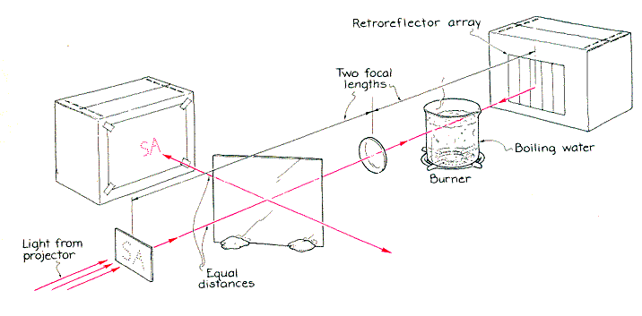 Scotchlite, made by the 3M Corporation, consists of glass beads embedded in a flexible backing. An arriving ray of light is refracted to the back of the bead, from which it is reflected back to the front. When it leaves the bead, it is parallel to the incident ray. This retroreflector is imperfect in that it displaces the final ray and inverts the final wavefront. One novel application of retroreflectors involves removing the distortion of a beam of light that passes through a nonuniform material. Place a concave mirror in the path of the light from the pinhole, positioning the mirror to get the best image of the pinhole on the screen. Insert a distorting element in front of the mirror. The element could be one of those ruffled plastic sheets that normally cover fluorescent bulbs, a glass slide covered with airplane glue, the plastic "bubble" material used in packing or almost any other nonuniform, transparent material. The distorting element destroys the image of the pinhole, scattering the light into a complex pattern that fills the screen. If you shift the distorting element across the opening of the mirror, the pattern on the screen changes chaotically. Now replace the mirror with a retroreflecting array. The exact position and orientation of the array are not important, but the distorting element should be directly in front of it and both the array and the distorting element should be illuminated. Although the distorting element jumbles the light and seemingly ruins any information about the pinhole's shape, an image of the pinhole appears on the screen. It is not perfect, being dim and fuzzy, but nonetheless it is there.