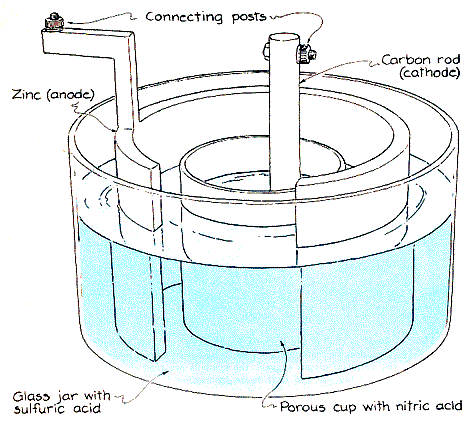 By the 1880's the world knew of aluminum's industrial possibilities. Hall started his work against this background. Initially he tried, as other experimenters had, to reduce aluminum from aluminum oxide (alumina) by purely chemical means. He and his older sister, Julia, prepared the aluminum oxide from household alum and washing soda. (Julia helped in many other ways, drawing on her college background in chemistry.) Hall also attempted to reduce the cost of producing aluminum with the Sainte-Claire Deville method by seeking an inexpensive way of preparing anhydrous aluminum chloride. In addition he experimented with the reaction between sodium metal and the sodium aluminum fluoride called cryolite (AlF3.3NaF), trying to find a new and inexpensive chemical reduction method. None of the experiments showed promise. While Hall was still in college he and Jewett had begun to investigate whether or not an electric current might make pure aluminum from an aluminum salt dissolved in water. The dissolved salt yields positive ions of aluminum. Hall and Jewett hoped that when current passed through the solution, electrons in the current would combine with the aluminum ions, creating aluminum metal. These electrolysis experiments required several amperes of direct current. It was difficult to produce electricity in a small town such as Oberlin, and so Hall and Jewett resorted to a classical electrochemical cell invented earlier in the l9th century by Robert Wilhelm Bunsen, whose gas-burner design is still found in laboratories. A battery, sometimes known as a Bunsen-Grove battery, consists of one or more cells. Each cell centers on a porous ceramic cup holding concentrated nitric acid. A carbon-rod electrode is inserted in the acid. The cup rests in a container filled with a dilute solution of sulfuric acid (one part acid to 10 parts water). The electrode in the sulfuric acid is a sheet of zinc that is curved around the container until it almost forms a cylinder. The battery produces about 1.9 volts across the terminals, with the carbon rod acting as the positive electrode.