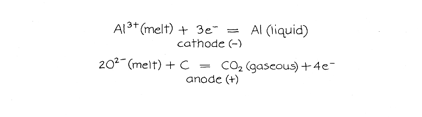 At the anode the zinc is converted into Zn2+ (a positive ion) with a release of electrons. At the cathode electrons combine with H+ and NO3- to yield nitrogen dioxide gas and water. Hall's battery employed seven of the cells. Depending on how he connected them, they generated between five and 10 amperes of current. The initial electrolysis experiments were carried out with aluminum fluoride dissolved in water. To Hall and Jewett's disappointment the products of the reaction were hydrogen gas and aluminum hydroxide at the cathode. These experiments were done in Jewett's laboratory during Hall's senior year. After his graduation in 1885 Hall moved most of his research to the woodshed. Since water solutions of aluminum salts had proved unpromising, Hall began to consider dissolving aluminum oxide in fused salts: salts heated to their melting point. Most fused salts are liquids similar to water in viscosity and thermal conductivity. Moreover, they conduct electricity well. (The idea of dissolving aluminum oxide in anything was bold at the time because the material was regarded as inert. For this reason it was commonly included in firebricks.) The coal-burning furnace Hall had used in earlier experiments could not generate and sustain the high temperature needed for the work with aluminum. Hall therefore set up a gasoline burner to heat the interior of an iron tube that he lined with clay. Although the new furnace could melt some fluoride salts such as potassium and sodium fluorides, it could not melt others such as calcium fluoride, aluminum fluoride and magnesium fluoride, each of which liquefies only at a temperature of at least 1,260 degrees Celsius. Unfortunately the pure fluoride salts that did melt in the furnace dissolved little aluminum oxide. Hall was an avid reader of Scientific American, which was then a weekly periodical. Craig believes Hall's work in electrolysis was spurred by a short item in the issue for October 24, 1885, reporting the success of a Mr. Graetzel in producing pure magnesium from a fused chloride salt through an electrolytic process. Hall later acknowledged that the process he discovered was similar to Graetzel's. Hall still had to deal with the fact that his furnace could not produce temperatures high enough to melt some of the pure salts that might dissolve appreciable amounts of aluminum oxide. He decided to experiment with cryolite, a mixture of sodium fluoride salt and aluminum fluoride salt. Salt mixtures often have lower melting points than the pure salts from which they are made. Hall synthesized a sample of cryolite and demonstrated that its melting point was within the capability of his furnace. In later tests he added aluminum fluoride to reduce the melting point even more. When he added aluminum oxide to the hot liquid, he found that it easily dissolved. By February 10, 1886, the experiments were completed.
