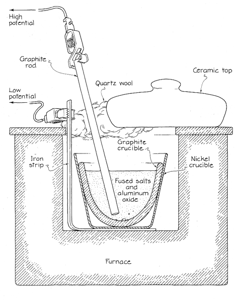 Hall made his discovery at the age of 22, eight months after he was graduated from Oberlin. His laboratory was in a woodshed behind his parents' house, his primitive equipment included several items he had made himself. Although he had pored over chemistry books since he was quite young, he had taken only two quarters of chemistry at college. His teacher there was Frank F. Jewett. Jewett lectured on the properties of aluminum, displaying a lump of the metal he had brought back from Europe. The chemical methods then employed to make the metal were so costly that aluminum sold for about the same price as silver. Jewett told his students that the person who found a method for producing aluminum commercially would benefit the world and make himself rich. Hall, who had already studied aluminum metallurgy, turned to another student and said, "I'm going for that metal.'' At the time the method of making aluminum metal had not advanced much beyond the work done in 1825 by Hans Christian Oersted, the Danish scientist who is remembered for his pioneering research on electricity. Oersted heated a mixture of dilute potassium amalgam (potassium metal dissolved in mercury) and aluminum chloride. After removing the mercury by distillation, he found a small, gray lump of material that he supposed was aluminum metal. In 1827 the German chemist Friedrich Wohler undertook to repeat the experiment. Failing to do so, he substituted potassium metal for the potassium amalgam. By means of this substitution the experiment yielded aluminum only as a black powder. Not until 1847 did Wohler succeed in obtaining a sample of aluminum that was large enough to reveal the characteristics of the metal. In 1854 the French chemist Henri Etienne Sainte-Claire Deville improved on Wohler's procedure by substituting sodium metal for potassium metal. A sample of aluminum produced by Sainte-Claire Deville's technique was exhibited at the 1855 Paris Exposition. The metal was demonstrably strong, light in weight, durable and resistant to corrosion. Among those who were impressed was Napoleon III, who envisioned outfitting his army with aluminum equipment for the impending war with Prussia. Commissioned by Napoleon, Sainte-Claire Deville improved his techniques, but aluminum still cost too much for wide use. From 1860 to 1880 the worldwide production of aluminum was about 1.5 tons per year.