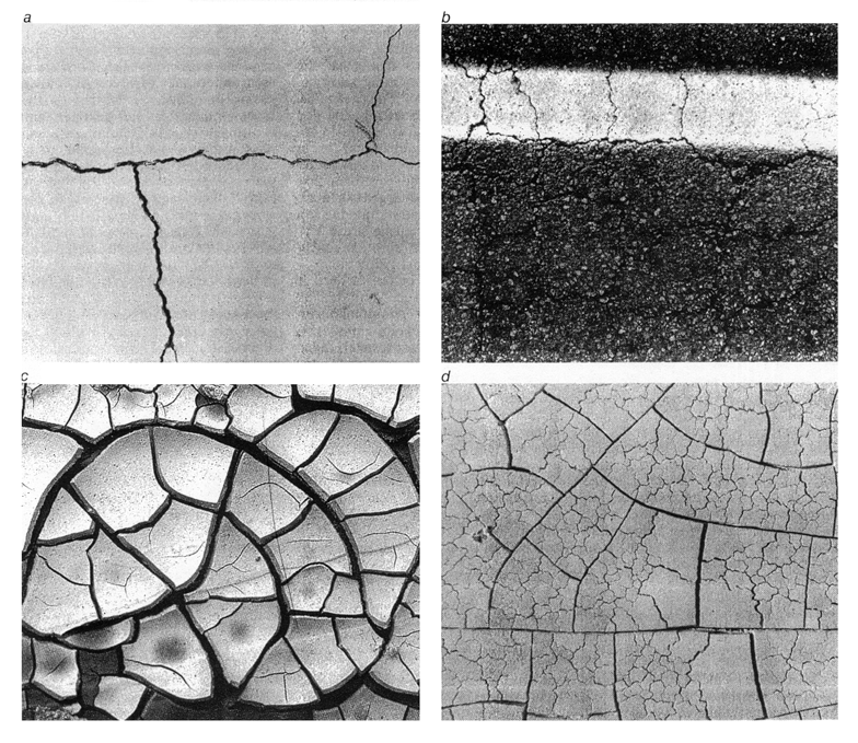 I surveyed many crack systems. On a tennis court I found cracks that developed when ground pressure forced the playing surface upward, putting it under tensile stress. The stress produced sinuous cracks with 90-degree intersections that created large polygons, most of them four-sided. A few of the intersections formed small triangular islands. A triangle may form when two nearby side cracks from the main crack curve toward each other, intersect and then continue as a single crack. A triangle may also form when two cracks intersect at some angle other than 90 degrees and new stress adds a short third crack. Polygonal-crack networks were also evident in blacktop road surfaces, but the polygons were typically smaller than the ones on the tennis court and more of the intersections were at angles other than cracks were noticeably sinuous. Some of them were curved, presumably because they changed directions when they approached older cracks. (Crack e production in road surfaces is complicated by the fact that a passing automobile displaces developing islands. Water creates additional stresses when it freezes and expands in the cracks.) Many concrete slabs display cracks and crack networks. Cracks develop where the slab buckles because of its weight or the stresses induced by a shifting support. Although many intersections are perpendicular, many are not, presumably because the stresses are complex and may be influenced by the shape of the slab, particularly if the slab is small.